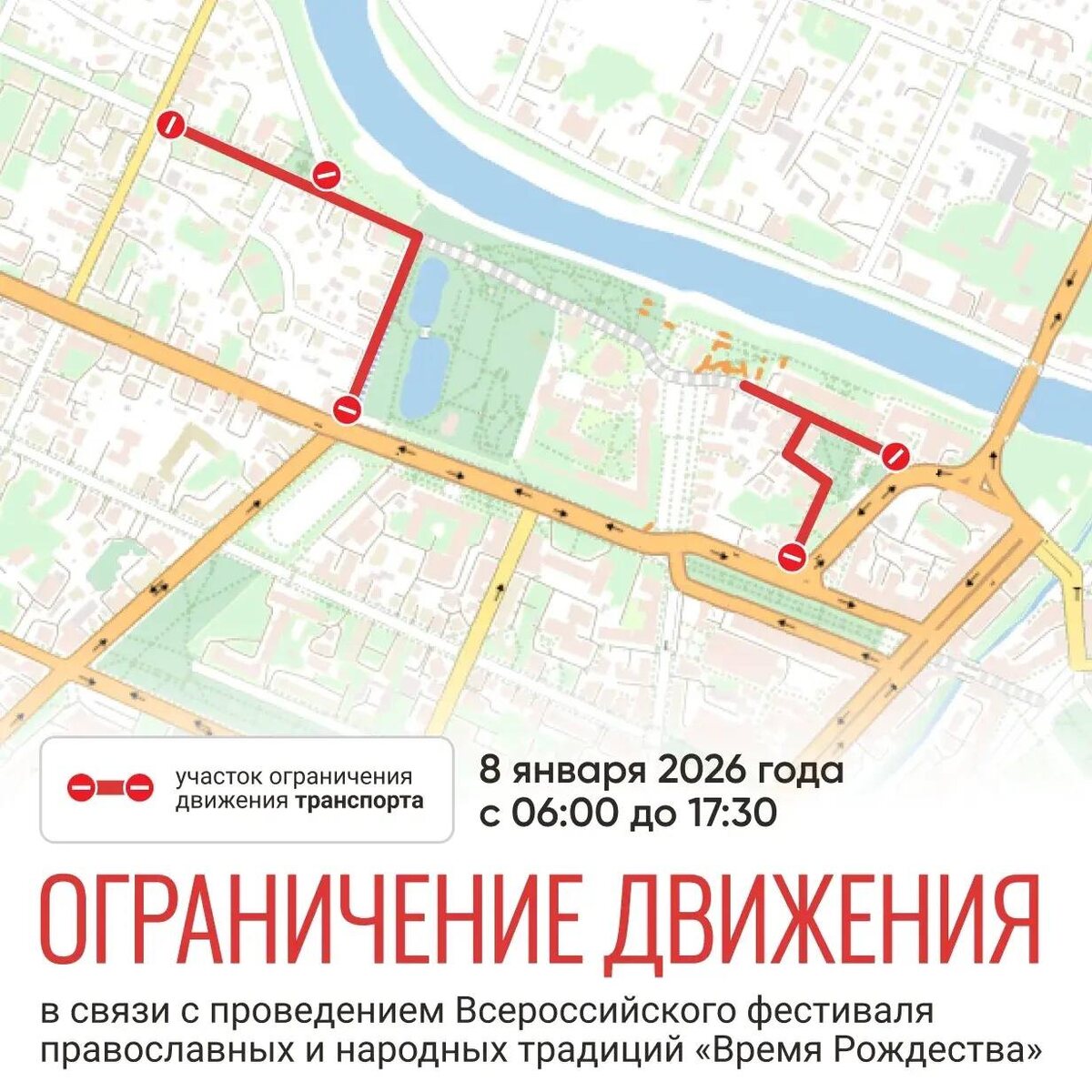 Это связано с проведением фестиваля «Время Рождества». С 6:00 до 17:30 действует временное ограничение движения и парковки транспорта. Проезд закрыт: — по улице Маяковского — от пересечения с улицей Воровского до улицы Ленинградской; — по улице Ленинградской — от перекрёстка с улицей Маяковского до проспекта Победы; — по улице Сергея Орлова — от дома № 4 до Кремлёвской площади; — по Торговой площади — от дома № 1 до улицы Сергея Орлова. Изображение: пресс-служба Администрации города Вологды. 📱 Telegram🐚📱 ВКонтакте🐚💙 Rutube
