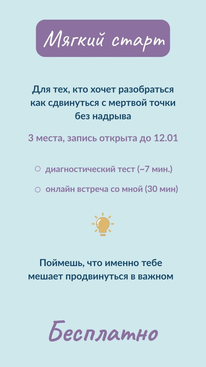 Хочется разобраться, как выстроить день, в котором хватает энергии и времени на себя? И наконец перестать откладывать важное? Это возможно. И начать легко! Приглашаю на курс «Лёгкий старт года» (12 января — 15 февраля). Мы найдём ваш подход, как двигаться к важным задачам на ресурсе, а не через насилие над собой. Группа до 10 человек. Форматы участия: 1⃣«Мягкий старт» — бесплатная консультация со мной (3 места) 📖поймёте, на чём сейчас стоит сфокусироваться, чтобы год начался легче 📖получите карту своего текущего состояния с пояснениями 📖заберёте 1–2 персональные рекомендации 📖поймёте, подходит ли вам курс и в каком формате Для записи отправляйте «Мягкий старт» мне в ЛС. 📌📌📌 2⃣ «Экспресс-тариф» — первые 2 недели курса 📖 Поймёте, что действительно важно в хаосе задач 📖 Соберете реалистичный план с учетом контекста жизни и состояния 📖 Реализуете часть плана с поддержкой 📖 Вернёте 2-10 часов личного времени 📖 Попробуете подход, где в фокусе не только надо, но и твои