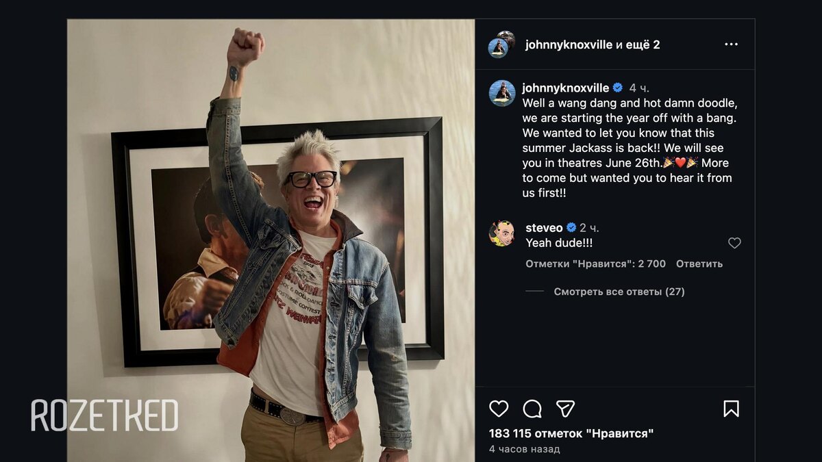 «Чудаки» вернутся с пятым фильмом — анонсом в соцсетях поделился сам Джонни Ноксвилл. Подробностей о проекте нет, но известна дата выхода — 26 июня. О том, что речь идёт именно о фильме, а не о каком-то другом релизе по франшизе, подтвердили в Variety. Ждём новую порцию опасных, мерзких и абсурдных трюков от 54-летнего Ноксвилла и команды. 💼 Rozetked | Подписаться