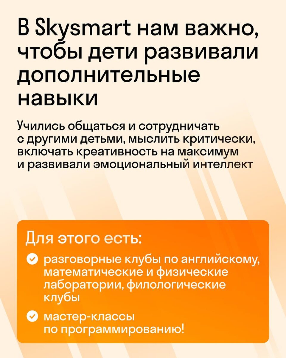 ? 👀 Нам важно, чтобы дети развивали дополнительные навыки: учились общаться и сотрудничать с другими, мыслить критически и включать креативность на максимум. Поэтому у детей есть: 👧🏻 Разговорные клубы по английскому — делаем творческие задания в интерактивном формате и общаемся на английском. ➕ Математические и физические лаборатории — прокачиваем логику и исследуем науку «руками». 📚 Филологические клубы — развиваем знание языка через сюжетные занятия, лингвистические игры и лайфхаки. 🎮 Мастер-классы по программированию — создаём проекты в Minecraft и игры на Scratch и Python. И конечно, клубы для дошкольников: 🎨 Творчество — развиваем креативность. 🌎 Английский язык — читаем сказки и учимся воспринимать английскую речь. ➕ Математика — учимся считать и распознавать геометрические фигуры. 📖 Чтение — преподаватель читает сказку, а дети думают, к чему могут привести действия персонажей. Всё это доступно бесплатно тем, кто учится на курсах или ходит на дошкольную подготовку.