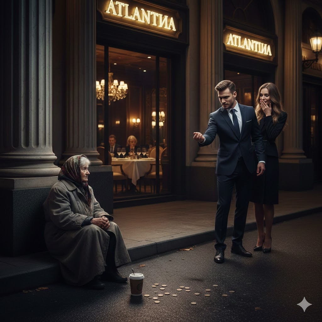 Они подошли к массивному крыльцу ресторана. Прямо у входа, в тени колонны, сидела фигура, которая явно не вписывалась в этот праздник жизни. Пожилая женщина в выцветшем платке и поношенном пальто, цвет которого было трудно определить под светом фонарей. Перед ней стоял стаканчик из-под кофе, в котором сиротливо поблескивали несколько мелких монет.