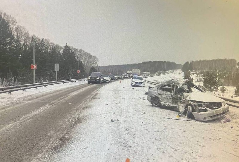 ». Сотрудники Госавтоинспекции Емельяновского района работают на месте смертельного ДТП, произошедшего в результате выезда на «встречку». Предварительно установлено, что 8 января в 13:00 на 784-м километре автодороги Р-255 «Сибирь» в Емельяновском районе 54-летняя женщина за рулём «Hyundai Accent», следуя со стороны Ачинска в сторону Красноярска, выехала на полосу встречного движения, где допустила столкновение с грузовым автомобилем «Вольво» с полуприцепом. В результате ДТП водитель легкового автомобиля скончалась на месте. Фото: 24_ГОСАВТОИНСПЕКЦИЯ