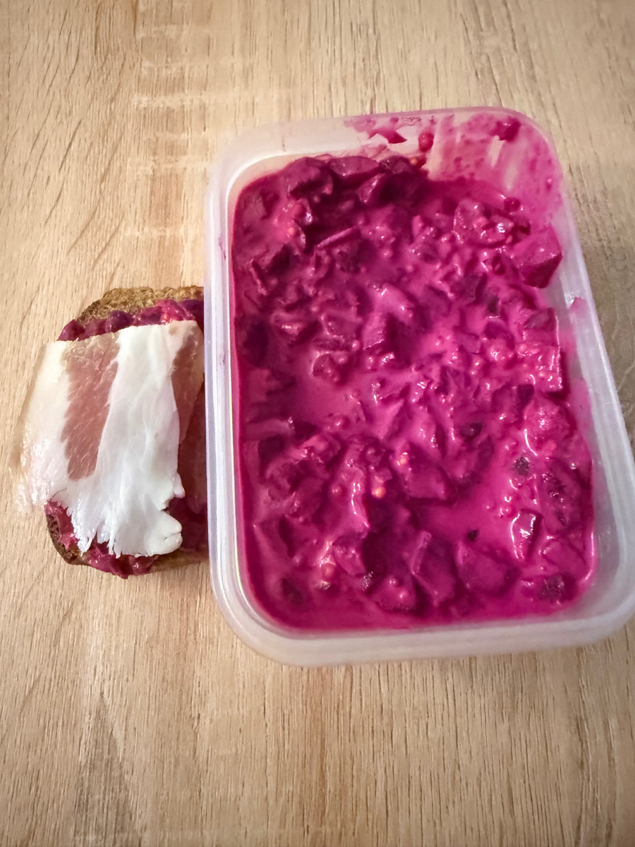 Берем свеклу, если она целая то режем мелко кубиками примерно 0,5х0,5 см. Тереть на терке нежелательно, потом во время еды поймете. Чеснок давим или натираем на мелкой терке. Все смешиваем со сметаной и горчицами. Данную смесь мажем на хлебушек и…. Ахреневаем от взрыва вкуса! Лично мне зашло на ржаном хлебушке с салом!