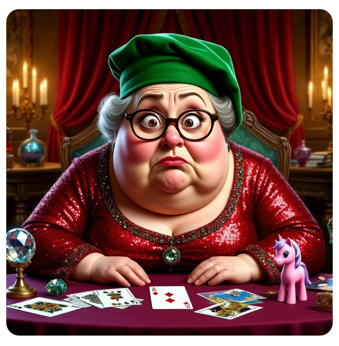 Н одета соответственно, халат с пайетками, колпак с пайетками, блестящие ботинки, возможно, с пайетками тоже. Н ищет истину. Истина прямо перед ней на экране. Это самая истинная истина из возможных, разумеется! Гадание Таро прямо в интернете, нет границ для настоящего настрадалуса. Мы видим выпавшую Н карту, перевернутого юношу в ярких одеждах желтого и оранжевого цветов, на голове у него шляпа с красным акцентным пером, в руках — посох с молодыми зелеными лепестками и новый телефончик, юноша стоит на земле оранжево-красного цвета, фон карты — голубой. Это Кловун Жезлов. В руках, не поверите, жезл. Но не спеши фукать, зритель, мы ведь не знаем, что такое Н спросила, а карты Таро отвечают ей сердитым голосом