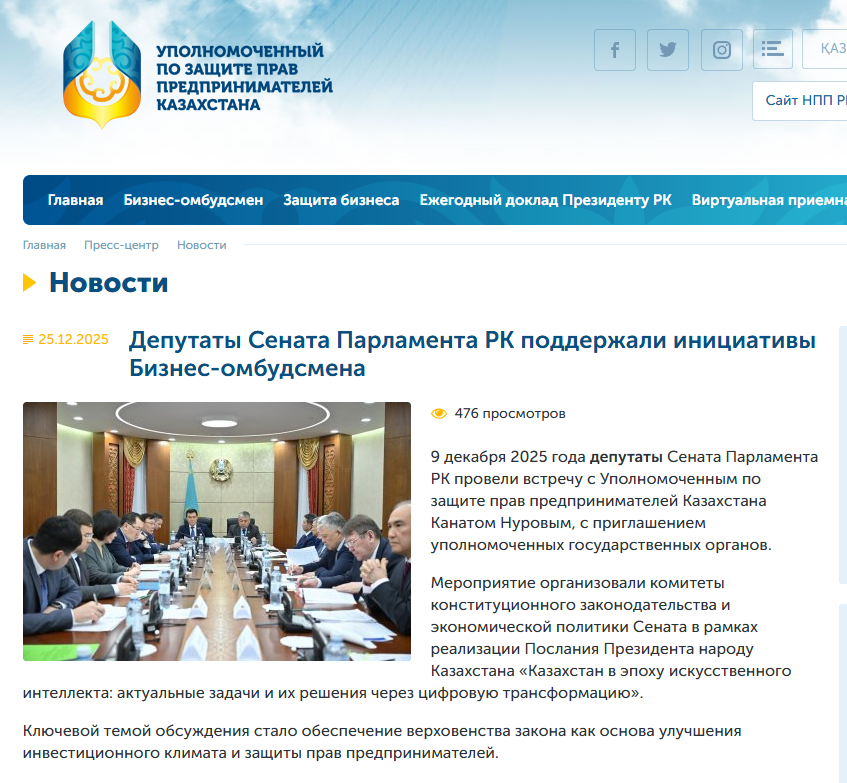 9 декабря 2025 года депутаты Сенат Парламента Республики Казахстан провели рабочую встречу с Канат Нуров, Уполномоченным по защите прав предпринимателей. В обсуждении приняли участие представители уполномоченных государственных органов.