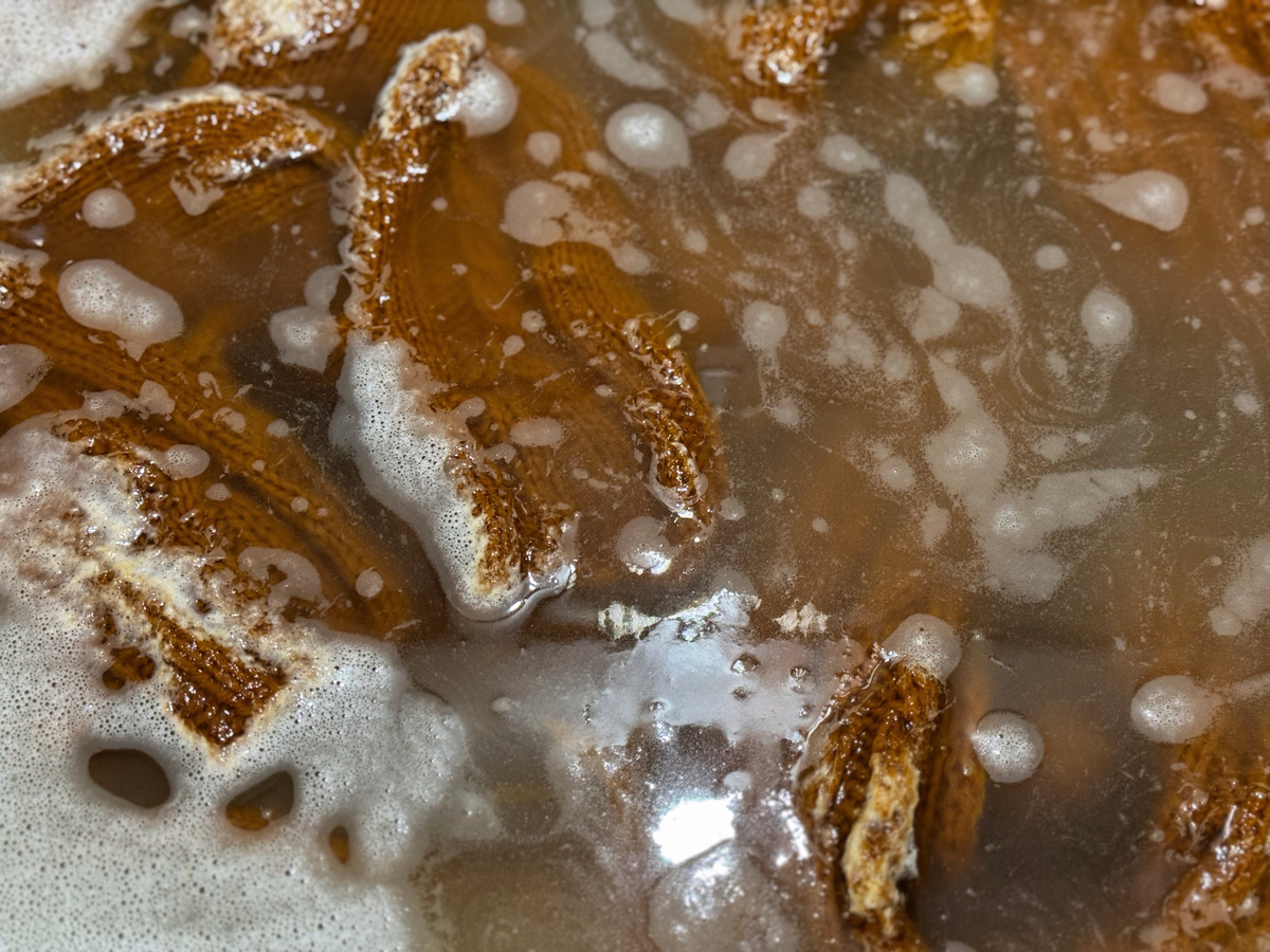 Во-первых, от высокой температуры вода в момент окрасилась в желтый цвет пряжи. Я даже испугалась, что весь цвет выстирается, и все вязаные вещи станут бледными или того хуже — пятнистыми. Слава богу, этого не случилось.