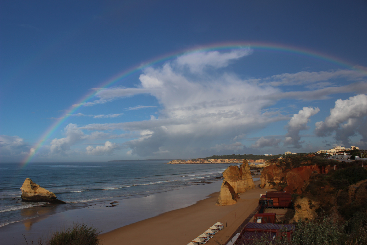 Океан, только что утихший после короткого дождя, спокойно дышит у песчаного берега, оставляя на мокром песке тонкие линии прибоя. Из-за горизонта к рыжим обрывам осторожно тянется радуга — хрупкая арка, перекинутая между двумя мирами: прозрачной глубиной Атлантики и нагретой солнцем землёй Алгарве.