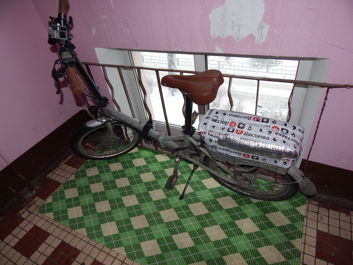 1)Утеплён аккумулятор. Только весной придётся часть утепления сдирать. Надо подумать о покупке нормального теплоизоляционного съёмного чехла. 2)По причине стекания с велосипеда грязи застелил под него ковёр. 3)В качестве эксперимента поставил на заднее колесо гидравлический дисковый тормоз. Есть минус - зимой слякоть летит на диск, потом, когда я стою на светофорах, эта слякоть мигом заледеневает, колодки примерзают к диску, так как у гидравлики всегда особо узенькая щель между диском и колодками. Но после нажатия на тормоз этот лёд ломается. Тормозит новый калипер отлично. Тормозные колодки - толстенные. Вероятно, в конце января, если не возникнут новые проблемы, поставлю такой же тормоз спереди. Ещё надо что-то с "вибростендом" на снегу делать. Размышляю, не приспустить ли чуток хотя бы переднее колесо...