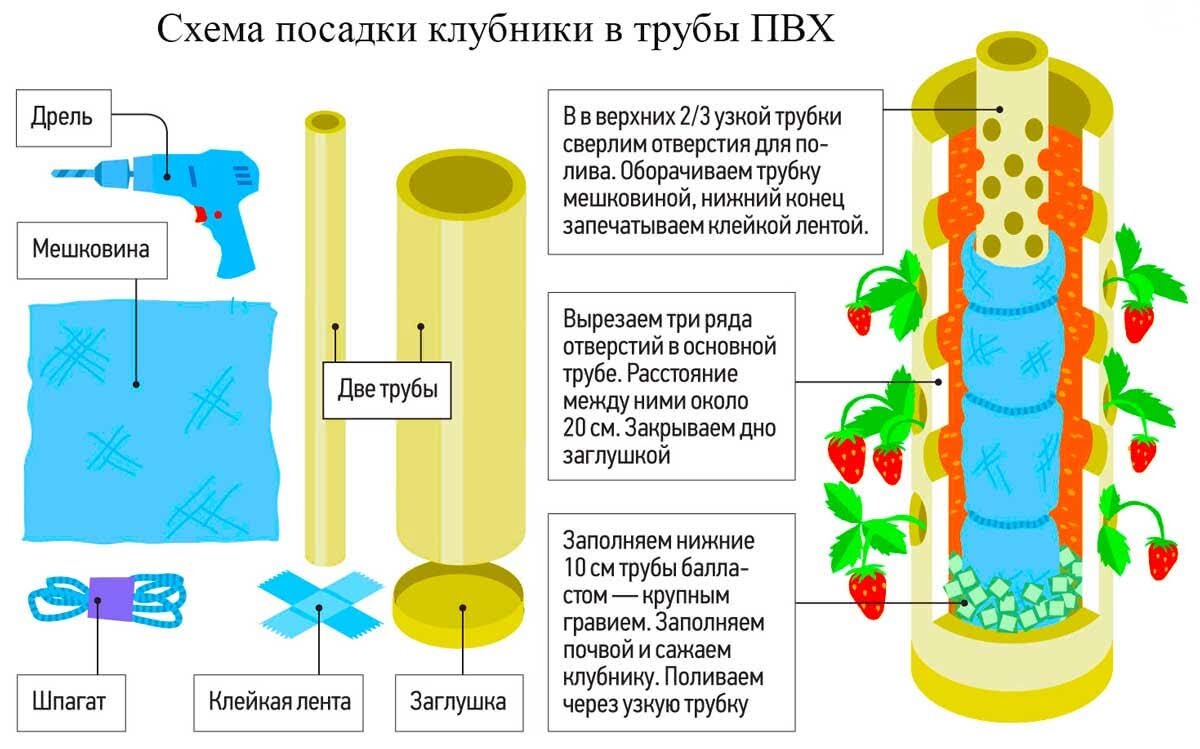 Важный момент: нельзя наполнять трубу наполовину, так как это ведет к тому, что цветоносы тянутся вверх и на краю отверстия под весом ягод перегибаются, а иногда и переламываются.