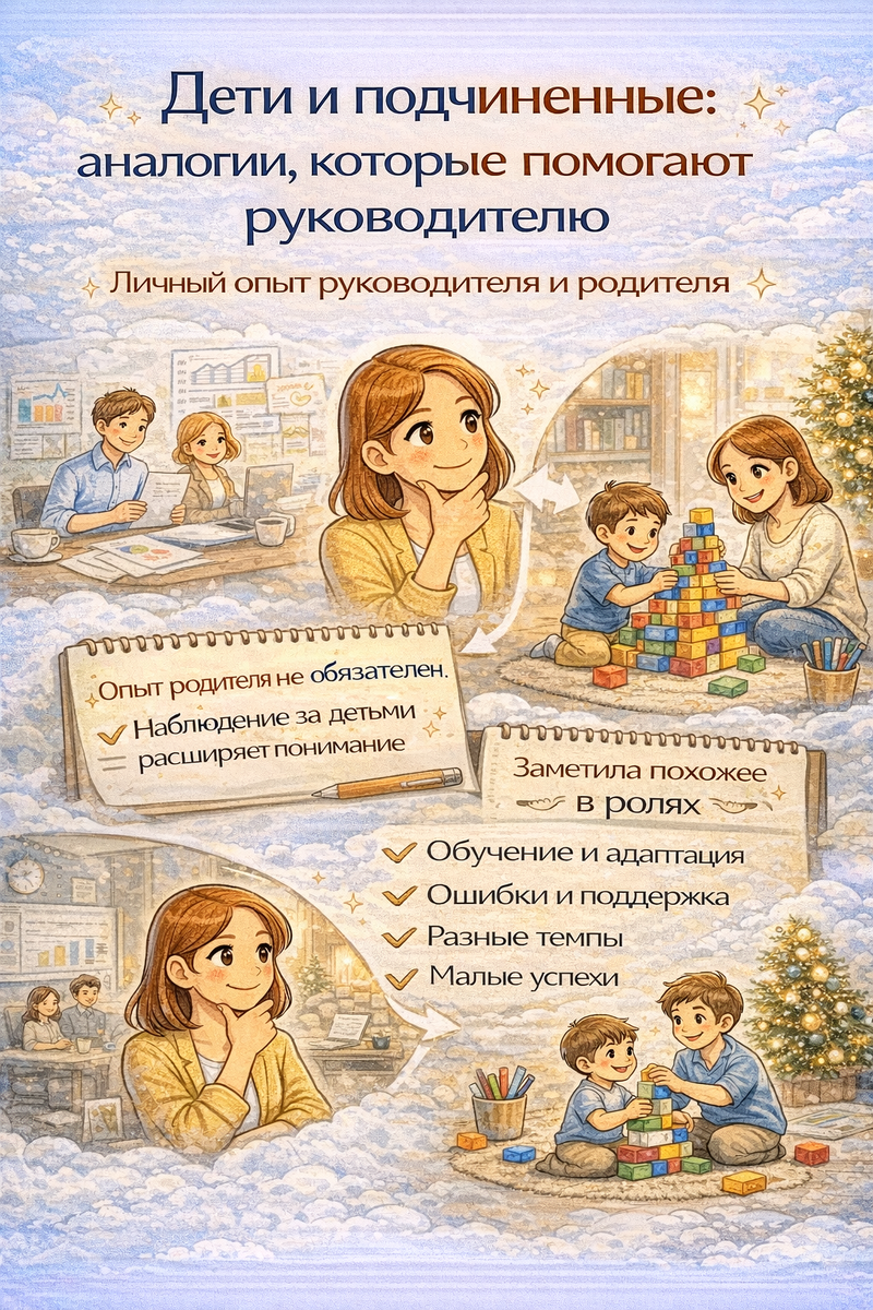 Некоторые могут подумать: если я часто провожу параллели между детьми и подчиненными, значит, я считаю, что быть руководителем могут только родители. На самом деле это совсем не так. Я начала свой путь руководителя, будучи бездетной. И именно этот опыт был для меня бесценен. Он позволил спокойно воспринимать новые ситуации, учиться принимать решения и адаптироваться без дополнительных «эмоциональных нагрузок», которые дают дети. Получение опыта в управлении — процесс ресурсоёмкий. С детьми было бы сложнее, особенно на первых этапах. Сегодня, когда у меня есть личный опыт материнства, я вижу интересные параллели между ролями родителя и наставника. Эти аналогии помогают в работе и позволяют лучше понимать сотрудников: Понимание этих параллелей позволяет мне эффективнее управлять командой. Я вижу, что руководитель — это одновременно наставник, поддержка и источник мотивации, а иногда даже «спокойный голос разума», который помогает сотрудникам преодолевать трудности. Важно помнить, что оп
