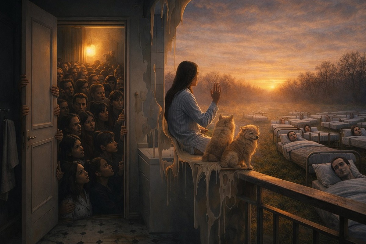 Приоткрытая дверь ведёт не в ванную, а прямо на улицу. Замка нет — только ладони на косяке и желание сбежать. За порогом толпа, плотная, как утренняя электричка в час пик: лица, тени — они не шевелятся, но давят. Эффект удушья создаётся не действием, а напряжением присутствия. Кажется, если расслабиться хоть на секунду, они ввалятся в дверной проём и раздавят меня, как смятый лист бумаги. А что, если бояться снова нечего? Я выбираю другую дверь. За ней — та же улица, но вывернутая: на поляне — ряды кроватей, и в них — люди, как фарфоровые куклы, неподвижные и холодные, будто на них кто-то примерил чужую угрозу. Они смотрят мне в глаза, не моргая. Наблюдают? Или ждут от меня какого-то ответа? Я вижу в них опасность, а что они видят во мне? Сначала в их взгляде жила вся моя тревога. Но любопытство призвало меня не бежать, а стать частью этого безумия. Вежливо, без вызова, без бега, я поздоровалась с ними. Их жестокость растаяла, а мир вокруг вдруг стал возможным местом для разговора. Я