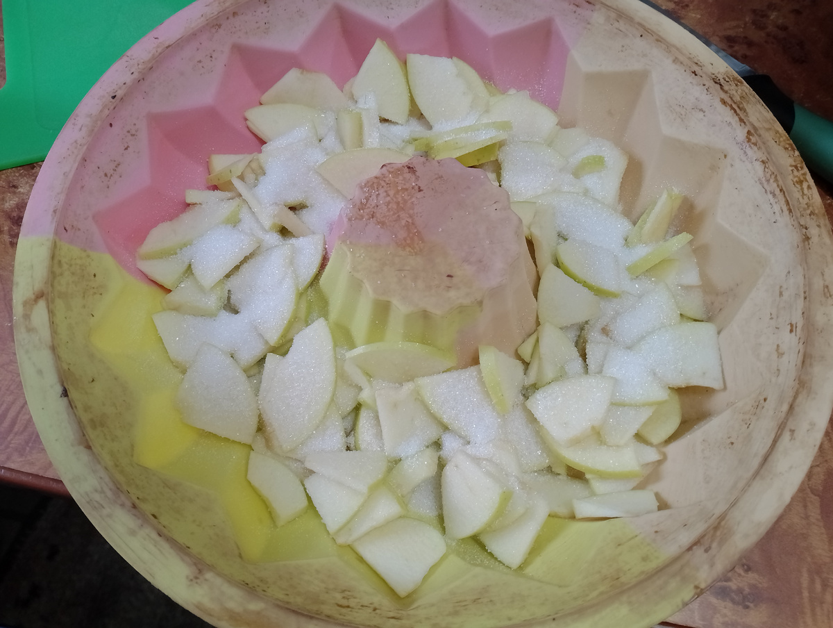 Яблоки очистим, порежем и сложим первым слоем, посыпав их сахаром.