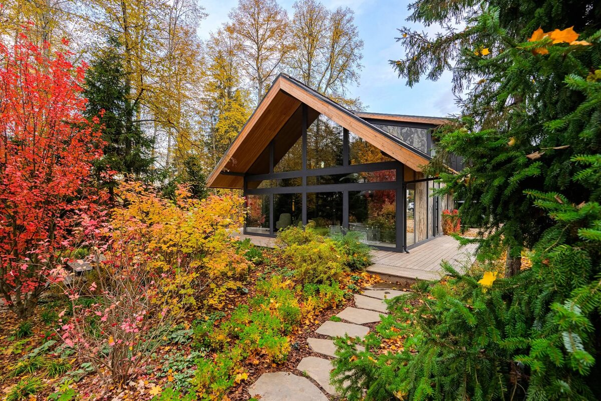 Участок почти 20 соток. Он с небольшим рельефом. С одной стороны, это лесной участок с настоящими лесными деревьями в большом количестве, но плюс еще и выполнен лесной ландшафт. Нам в последнее время очень везет на такие лесные участки, они очень хорошо воспринимаются и потенциальными покупателями, и зрителями. Потому что, когда у тебя дом вписан в такую природу и еще есть дополнительный уровень озеленения, которым можно наслаждаться практически круглогодично, это просто кайф. А здесь, по сути, ландшафтом занимался сам собственник, потому что у него основной бизнес связан с благоустройством и ландшафтом.
