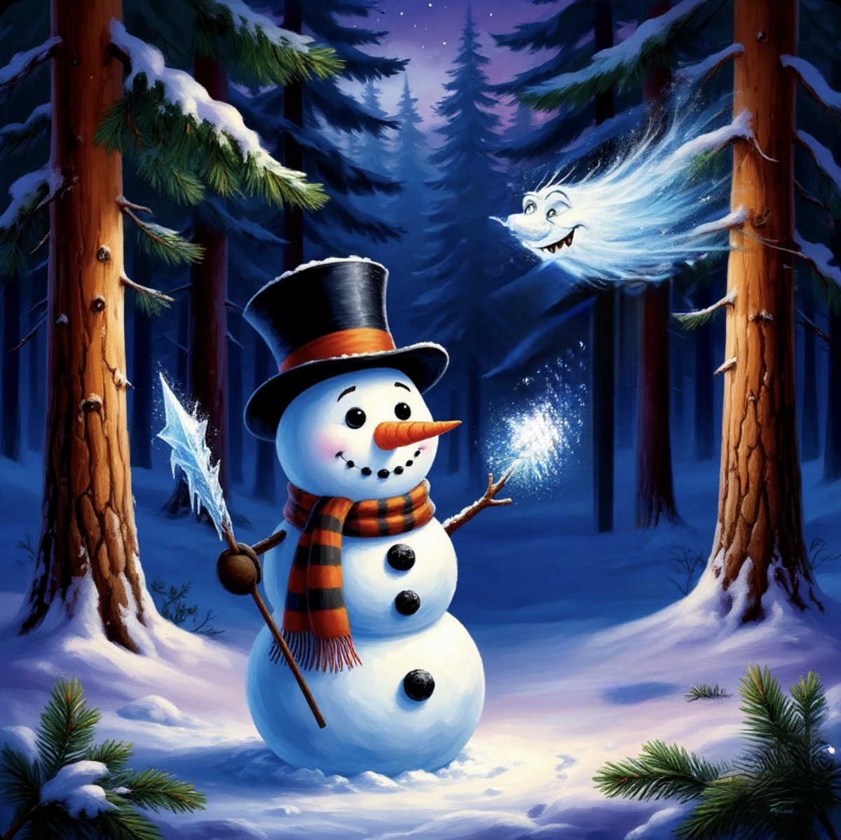 На краю деревни, прямо под окнами булочной, стоял смешной снеговик. Все звали его Снеговичок-Чудачок. И характер у него был соответствующий. Он носил полосатый оранжевый шарф толстой вязки, а на голове у него красовался новенький джентльменский цилиндр.