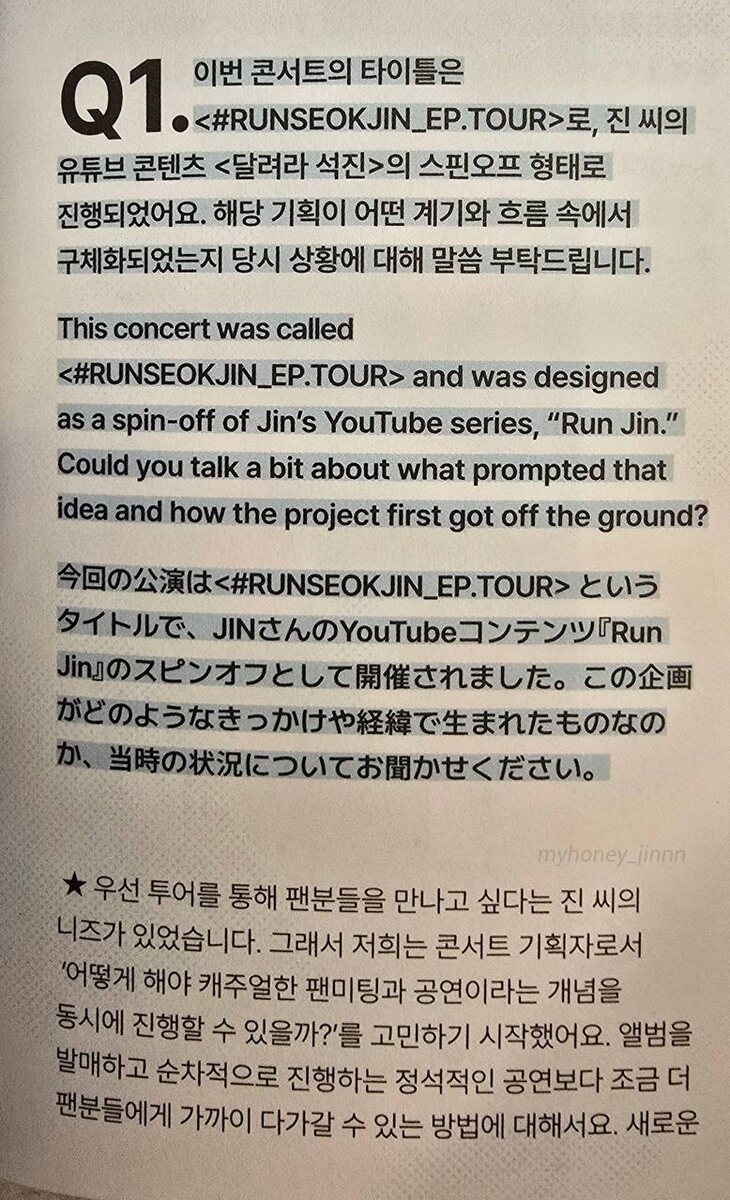 ": ΠΠΎΠΏΡΠΎΡ 1: ΠΡΠΎΡ ΠΊΠΎΠ½ΡΠ΅ΡΡ Π½Π°Π·ΡΠ²Π°Π»ΡΡ "RunSeokJin_Ep.Tour" ΠΈ Π±ΡΠ» Π·Π°Π΄ΡΠΌΠ°Π½ ΠΊΠ°ΠΊ ΡΠΏΠΈΠ½-ΠΎΡΡ YouTube-ΡΠ΅ΡΠΈΠ°Π»Π° ΠΠΆΠΈΠ½Π° "Run Jin". ΠΠ΅ ΠΌΠΎΠ³Π»ΠΈ Π±Ρ Π²Ρ ΡΠ°ΡΡΠΊΠ°Π·Π°ΡΡ Π½Π΅ΠΌΠ½ΠΎΠ³ΠΎ ΠΎ ΡΠΎΠΌ, ΡΡΠΎ Π½Π°ΡΠΎΠ»ΠΊΠ½ΡΠ»ΠΎ Π½Π° ΡΡΡ ΠΈΠ΄Π΅Ρ ΠΈ ΠΊΠ°ΠΊ ΠΏΡΠΎΠ΅ΠΊΡ Π½Π°ΡΠ°Π» ΡΠ΅Π°Π»ΠΈΠ·ΠΎΠ²ΡΠ²Π°ΡΡΡΡ? ΠΡΠΎΠ΄ΡΡΠ΅Ρ: ΠΡΠ΅ΠΆΠ΄Π΅ Π²ΡΠ΅Π³ΠΎ, ΠΠΆΠΈΠ½ ΠΎΡΠ΅Π½Ρ Ρ