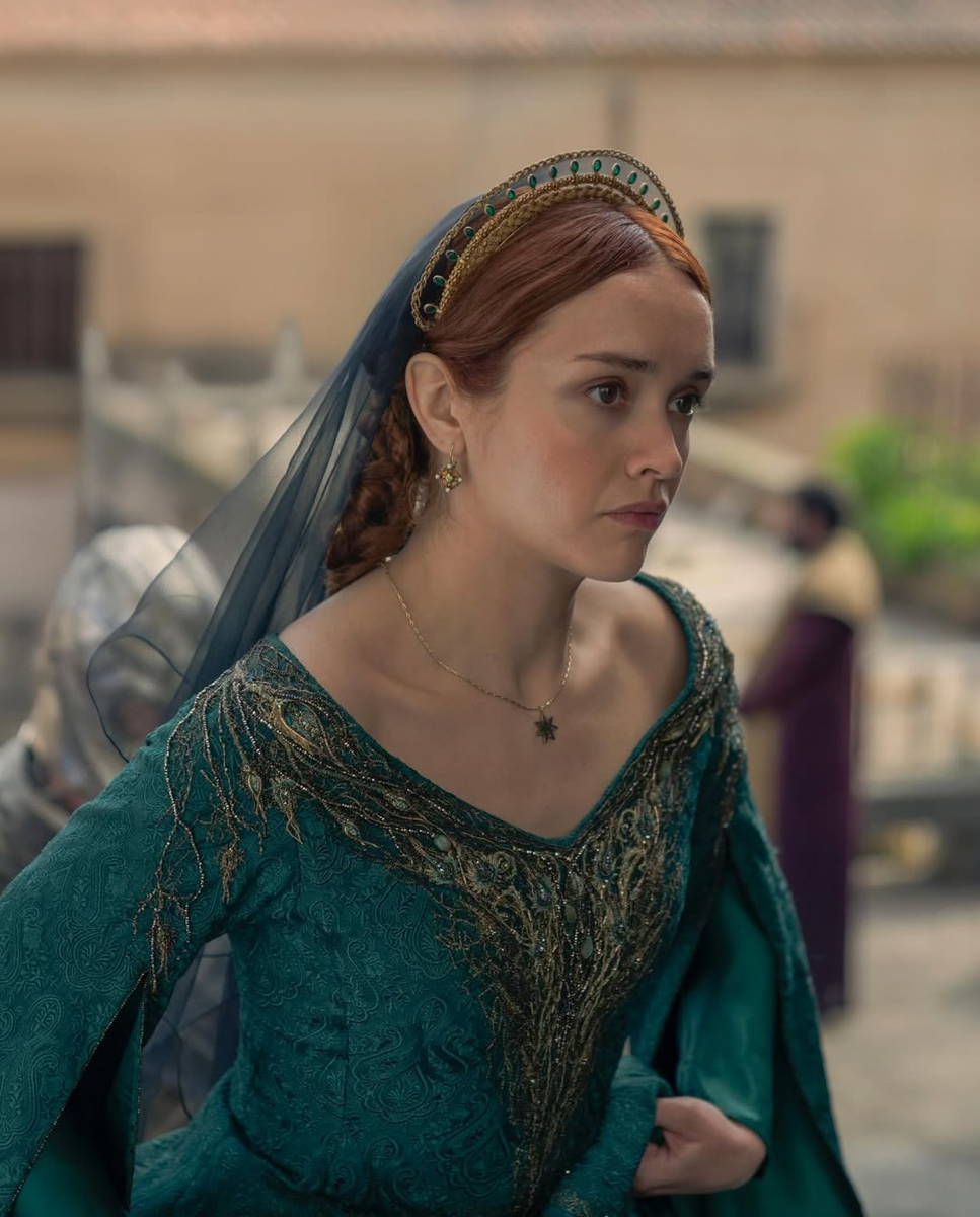 Алисента описана таким образом, что предстает теплой и заботливой. Она искренне заботится и о Рейнире; есть сцена, где она называет ее «дочерью» на пиру, и это не просто вежливо, а нежно.