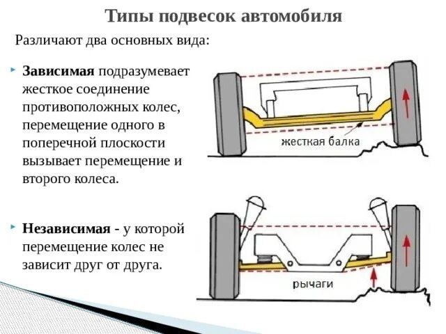 Работа передней и задней подвески автомобиля зависит от типа конструкции. Различают два типа подвески — независимую и зависимую.