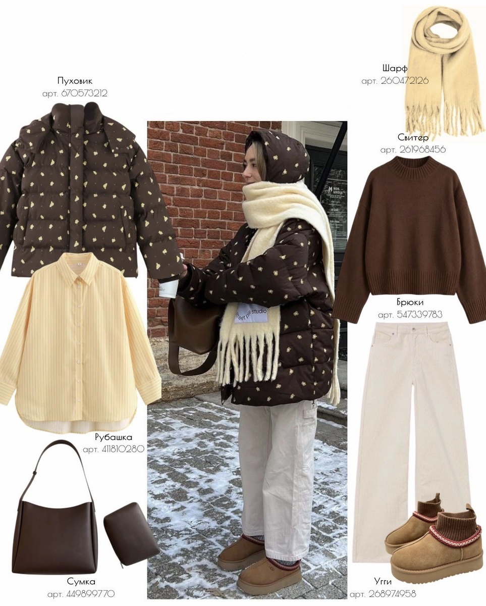 Иногда лучший стиль — это не «сложно», а «вкусно». На фото именно такой случай: тёплая шоколадная база, сливочные оттенки, мягкие фактуры и одна игривая деталь в верхней одежде, которая делает образ узнаваемым. Здесь всё про комфорт, но без потери аккуратности: силуэт собран, палитра выверена, аксессуары поддерживают настроение, а вещи легко миксуются между собой и с вашим гардеробом. Ниже — подробный разбор каждой находки строго по порядку артикулов, с понятными стилистическими подсказками.