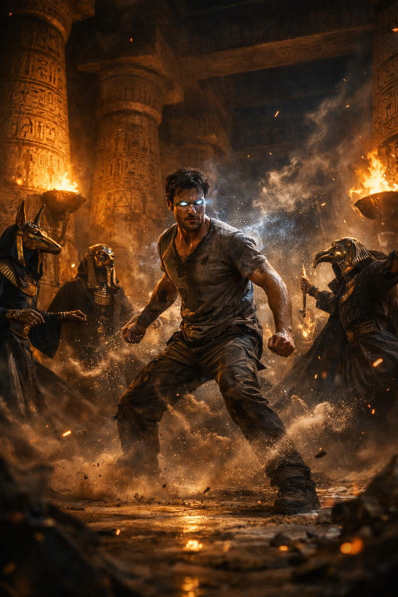 Он стоял посреди пыльных развалин. Перед ним — каменные колонны, покрытые иероглифами, между ними — пламя факелов, танцующее на закате. Древний Египет. Храм Осириса. Воздух был плотным, полным песка и жара, как дыхание времени. Тени вытягивались по земле, и в них уже двигались фигуры.