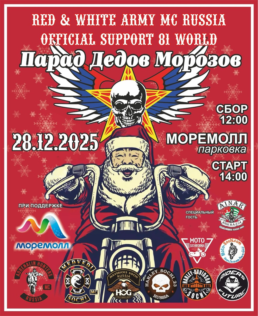 С наступающим Вас новым годом мото братья и сестры. Внимание ‼️ 28.12.2025 мото парад Дедов Морозов. Сбор на стоянке Море Молла В 12:00 Старт колонны в 14:00. В параде принимают участие костюмированные райдеры на мотоциклах. В колоне соблюдается правило поведения передвижения. Мужчинам в роле снегурочки участие в колонне запрещено)