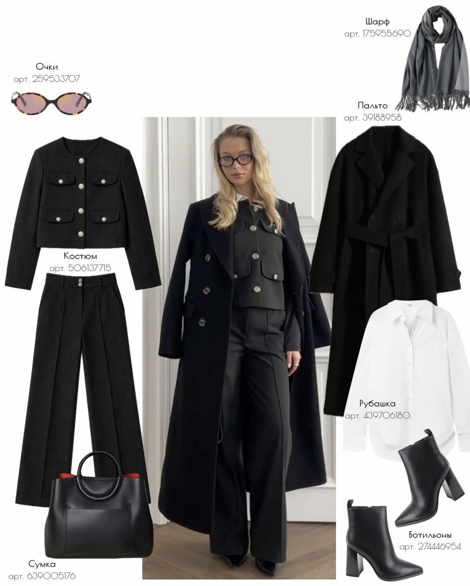 Есть образы, которые сразу звучат уверенно — без лишних деталей, без попыток «понравиться», но с безупречной подачей. На фото именно такой вариант: чёрная монохромная база, строгие линии, белая рубашка как знак вкуса и чистоты, и мягкие серые нюансы в шарфе. Это комплект, который одинаково уместен в деловой среде, на встречах, в театре и даже в путешествии — всё зависит от того, насколько «собранно» вы его носите. Ниже разбираю каждую находку строго по порядку артикулов, максимально подробно: ткань, силуэт, роль в комплекте и стилистические приёмы.