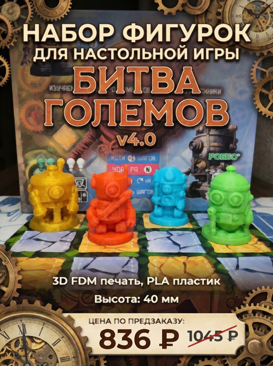 %. https://simplrobot.ru/store Изготовленные методом 3D-печати на FDM-принтере из PLA-пластика, они сделают игровой процесс визуально и тактильно приятней + добавят в игру дополнительные бочки, камни и порталы. Роботы будут изготовлены из цветного пластика, а компоненты игрового поля будут напечатаны из серого пластика, поэтому вы сможете позднее раскрасить их (на фото примеры из зеленого пластика). Печатать фигурки роботов и компоненты будем под заказ, на один комплект у нас уходит один рабочий день. Планируем начать делать это уже в новогодние праздники, как придет серый PLA пластик (цветной у нас в наличии). P. S. Вы также можете свободно скачать STL-файлы и распечатать роботов и компоненты самостоятельно: https://disk.yandex.ru/d/ZIEQmfQ1NEFEnQ Все можно печатать без поддержек.