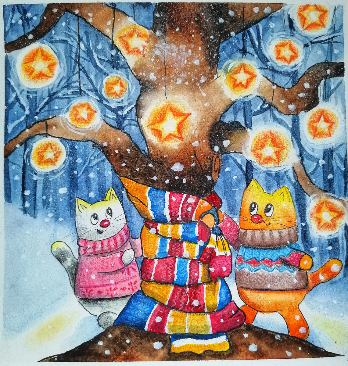 Очередная иллюстрация, старательно перерисованная с референса ☺️ и навеянные работой рифмы. Гляда на эту картинку, представилась небольшая история про маленьких котят и зимнее чудо в лесу)