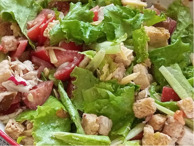 Самый любимый салат ранней весной или полноценный ужин. Ингредиенты: - листья салата – 1 пучок или 0,5 салата Айсберг; - куриная грудка – 1 крупная; - яйца – 4 штуки; - сыр твердых сортов – 60-70 гр.; - свежие томаты – 4 шт.; - сухарики – примерно 80-100 гр.; - соль – по вкусу. Для заправки: - майонез – 2 ст. ложки; - масло растительное – 3 ст. ложки; - горчица – 0,5 чайной ложки. Яйца отварить в подсоленной воде в течение 10 минут, охладить, очистить, натереть на крупной терке или нарезать полосками. Куриную грудку отварить в подсоленной воде, остудить или куриную грудку прорезать вдоль на две части, обжарить с двух сторон подсолив, поперчив по вкусу, нарезать полосками. Помидоры нарезать кубиками. Сыр натереть на крупной терке. Салат Айсберг или листья салата промыть, просушить, нарвать руками. Сухарики для такого салата можно приобрести в магазине или запечь в духовке присыпав сушеным чесноком и молотым перцем, или тоже самое сделать на сковороде использовав 100 гр. белого батона, н