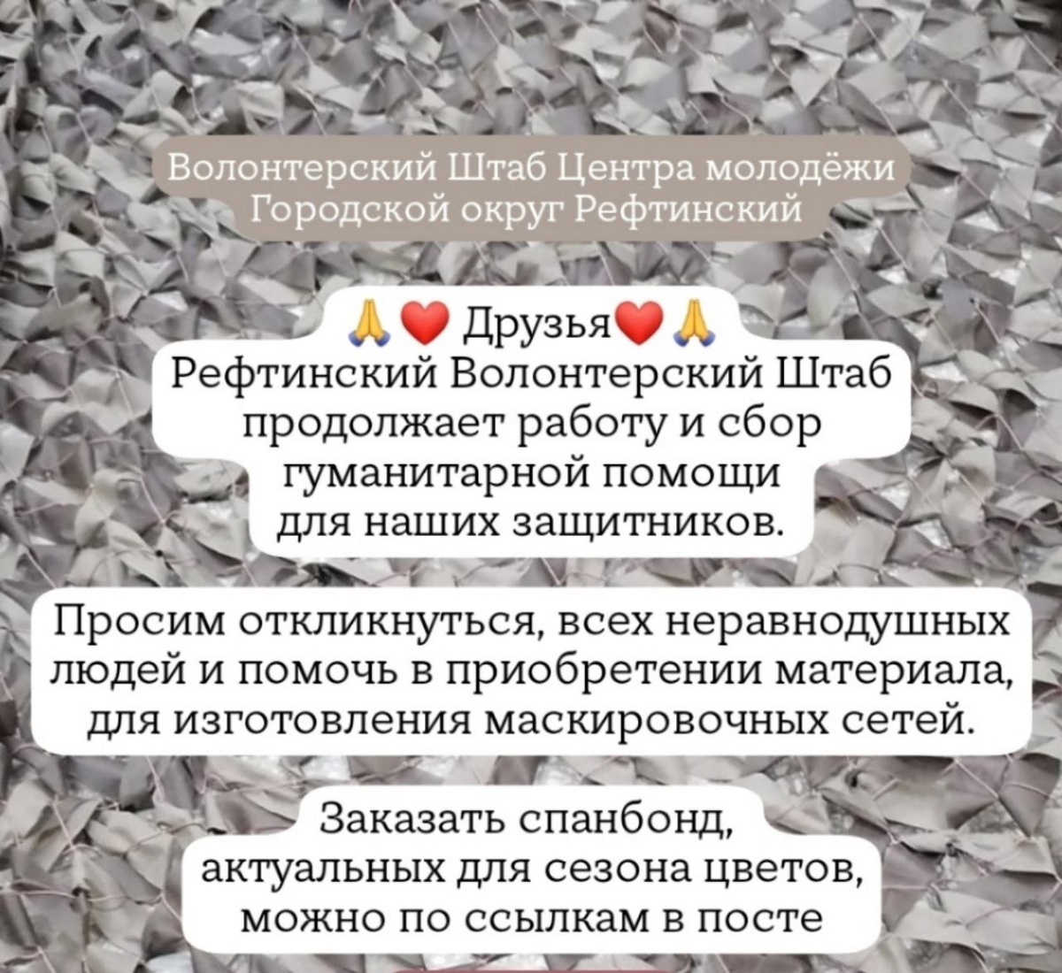 Всего несколько дней осталось до наступления нового 2026 года. Большенство уже закупили и приготовили подарки, спланировали где проведут долгие зимние праздники... Прошу вас, среди всей предновогодней суеты уделить свое внимание нашим защитникам и помочь им! Как же не хватает юута и тепла нашим ребятам, которые сейчас находятся в зоне боевых действий. ‼️К нам поступила очередная заявка от наших земляков на маскировочные сети‼️ Рефтинский Волонтерский Штаб продолжает работу и готов выполнить эту заявку с вашей помошью. Просим откликнуться, всех неравнодушных людей и помочь в приобретении материала, для изготовления маскировочных сетей. Заказать спанбонд, актуальных для сезона цветов, можно по ссылкам: Спанбонд Белый камуфляж, 20см*275м ткань для маскировочных сетей ozon.ru/t/dQ4YIMN Спанбонд "СЕРЫЙ / ГРЯЗНЫЙ СНЕГ", ширина 40см, длина 250 для маскировочных сетей ozon.ru/t/oE6JrLP Спанбонд "СНЕГ / ГРЯЗНЫЙ СНЕГ", светло-зеленый, ширина 40см, длина 250м, ткань для маскировочных сет