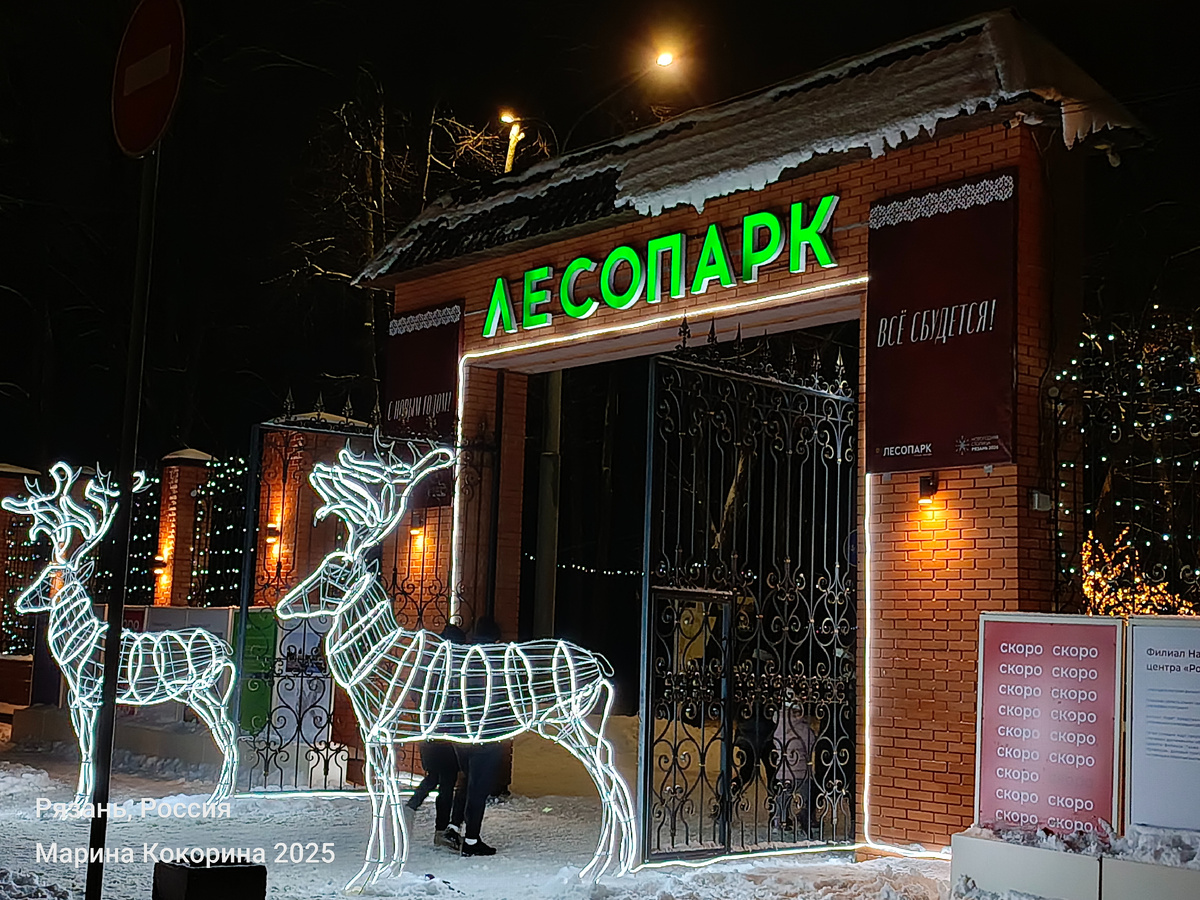 В моём блоге уже столько статей о приближающемся Новом годе, о том как Рязань подготовилась к празднику, что, кажется, добавить уже и нечего. Но сегодняшний вечер был особенным, и я не могу не поделиться этой сказкой с вами. До 31 декабря — меньше недели. Сегодня редкий для конца декабря тёплый выходной, всего -1°, и мы отправились на вечернюю прогулку в наш любимый рязанский «Лесопарк». На входе гостей уже встречала сияющая пара: величественные светящиеся олени, словно сошедшие с открытки. А дальше — море огней. Иллюминация окутала каждую аллею, каждую ветку, превращая привычный лес в волшебный мир. Но главное украшение — это, конечно, люди. Их было очень много: семьи с детьми, влюблённые пары, компании друзей. Все улыбаются, все ждут новогоднего чуда. Парк гудел, как улей. Дети с восторгом катались на аттракционах, а их смех смешивался с праздничной музыкой. И вот среди толпы мы встречаем… Деда Мороза и Снегурочку! Они не просто стояли для фото, они гуляли, общались, дарили улыбк