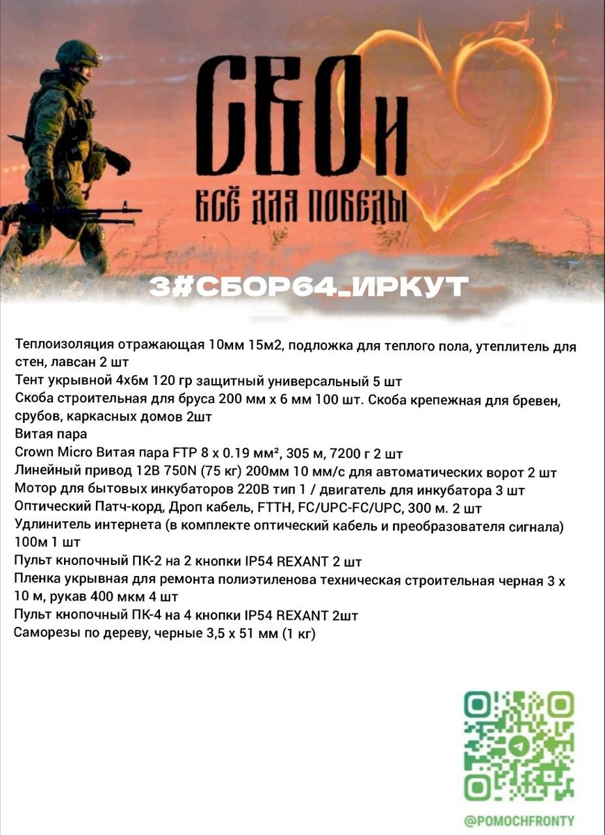 🔥 😶😶😶😶😶 Нашему бойцу «Иркут» и его команде для эффективной работы в полевых условиях требуется серьёзное техническое оснащение. В этом списке — не просто вещи, а элементы для создания защищённой позиции, надёжной связи и автономности. Что нужно и для чего это на передовой: · Термомаскировка и базовая защита · Теплоизоляция, тенты, укрывная плёнка — для защиты от обнаружения беспилотниками с тепловизорами и обустройства укрытий. · Саморезы, скобы для бруса — для укрепления полевых сооружений и позиций. · Сеть и связь · Витая пара и оптические патч-корды — для создания проводных сетей передачи данных, которые устойчивее к помехам, чем радиоканал. · Удлинитель интернета (оптика + преобразователь) и бронированные оптические кабели — для подключения удалённых постов и организации связи на большом расстоянии в сложных полевых условиях. · Кнопочные пульты — для дистанционного управления оборудованием. · Автоматизация и силовые элементы · Линейные приводы (12В, 750N) — могут использо