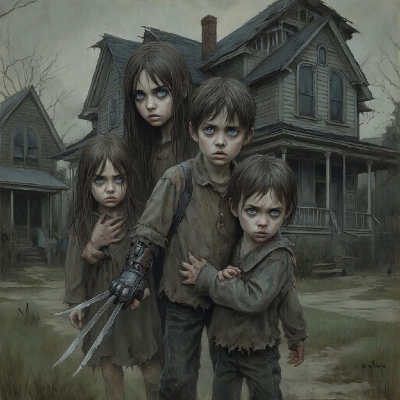 Старшей была девочка лет четырнадцати с пронзительно‑синими глазами. Она называла себя Хлоя. Средним — мальчик по имени Рейз, вечно прятавший руки в карманах, словно что‑то скрывал. Младшими одногодками — девочка Лия, которая разговаривала только шёпотом и рисовала странные символы на стенах и молчаливый мальчик Итан.