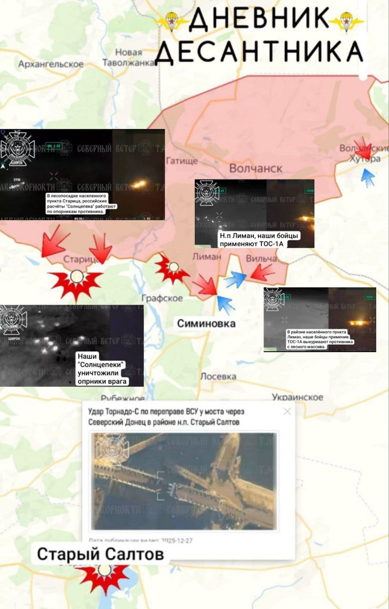 Докладывает Добрый🫡 Южнее Волчанска продолжаются бои в треугольнике между населенными пунктами Лиман, Вильча, Симиновка. ВС РФ наступают вдоль Северского Донца на юг. Противник пытается зайти на южные окраины населенного пунка Вильча, чтобы вернуть свои утраченные позиции. Восточнее Волчанска в населенном пункте Волчанские Хутора пока еще присутствует враг. Основные силы ВСУ брошены на Купянское направление, это немного облегчает работу наших подразделений на Волчанском и Великобурлукском участках. 🔥 В Харькове ВС РФ нанесли удар высокоточным оружием по цехам по изготовлению ракетного вооружения для ВСУ на территории машиностроительного завода. 🔥 В Харьковской области в результате разведывательных мероприятий расчет спецназа 6 гв.армии ЛенВо обнаружили и уничтожили вражескую САУ 2С1 "Гвоздика". (видео 1) 🔥 Бойцы ВС РФ силами расчёта РСЗО "Торнадо-С" уничтожили переправу в районе населённого пункта Старый Салтов, что позволило полностью нарушить логистику врага. (видео 2) ▫️