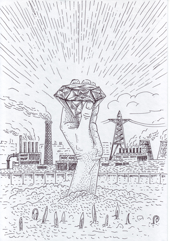 Темный кадр, Рука с сияющим алмазом пробивается из под земли и освещает все вокруг (как на референсе). Затем алмаз гаснет и рука с алмазом уходит обратно под землю, кадр затемняется, как в первом кадре.