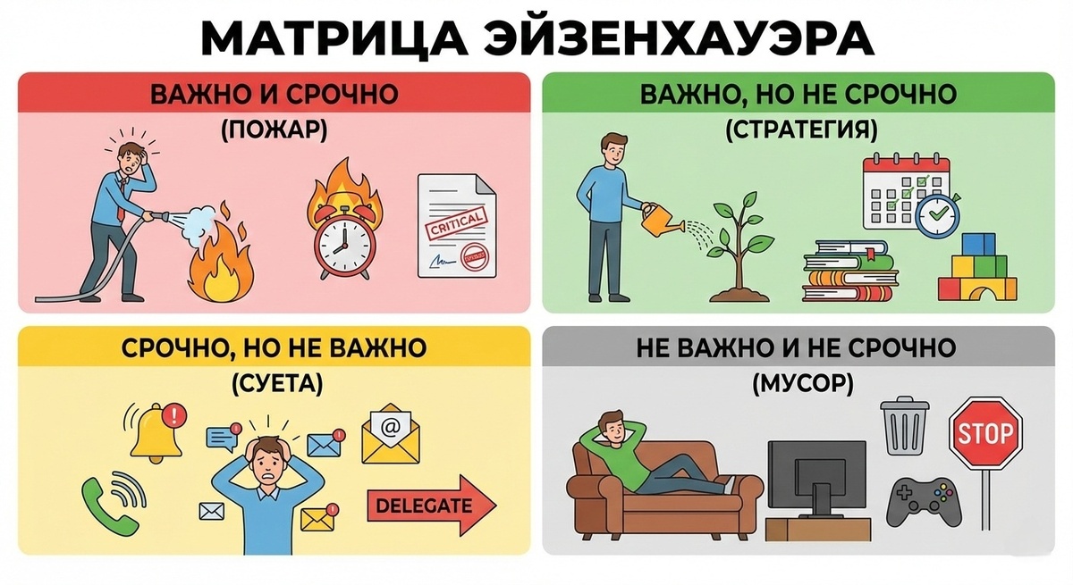 Дуайт Эйзенхауэр, 34-й президент США и генерал, решал задачи государственного масштаба, используя простую схему из четырех квадратов. Она помогает мгновенно понять, на что стоит тратить силы, а что — просто информационный шум.