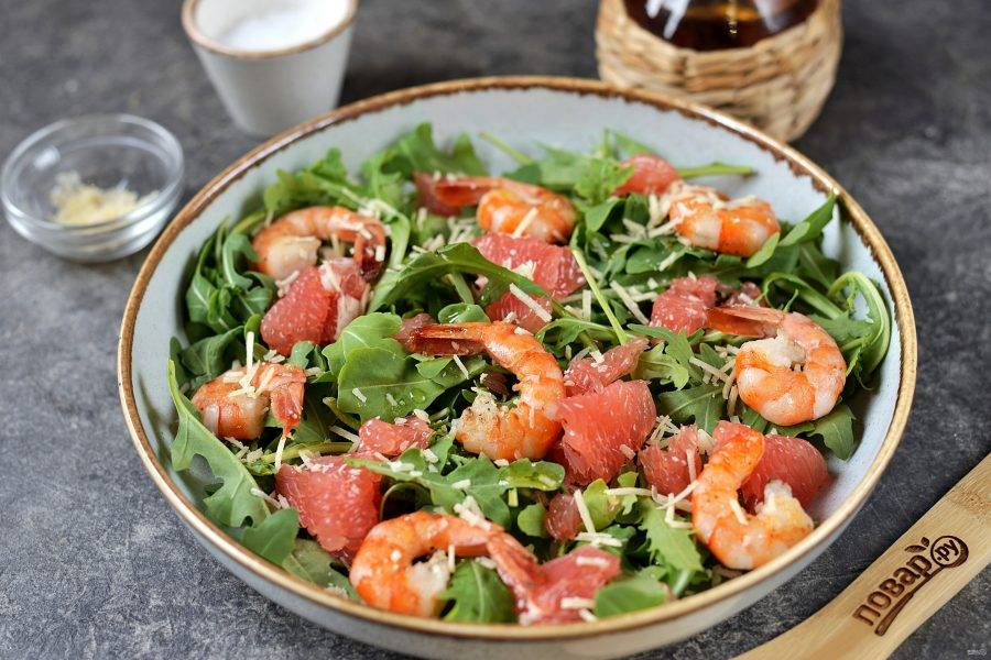 Этот салат прекрасно сочетает в себе сладость грейпфрута и нежность креветок, создавая свежий и яркий вкусовой букет. Приятного аппетита!