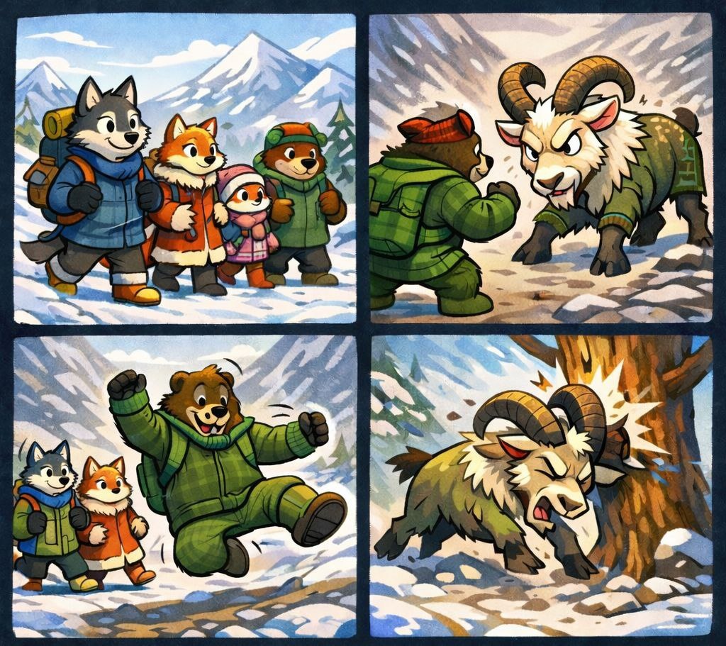 Но козёл не стал разговаривать. Он вдруг разбежался так резко, что снег из-под копыт полетел в разные стороны, и понёсся прямо на Медведя, выставив рога.