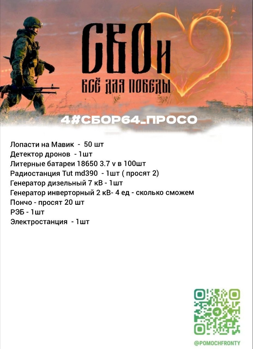 🌀 😶😶😶😶😶 🎯 Сбор для «Просо». 255-й штурмовой полк. Донецкое направление. #декабрь25 Группа «Просо» передали насущную просьбу от пехоты легендарного 255-го штурмового полка. Чтобы держать оборону и наступать, им критически не хватает ключевых вещей для разведки, связи и выживания в полевых условиях. Поможем выполнить запрос хотя бы частично. Список составлен самими бойцами. Нужно всё и сразу: · 👁️ Глаза в небе и защита от них: · Лопасти на Mavic 3 — 50 шт. (расходник первой необходимости). · Детектор дронов — 1 шт. (портативные модели для обнаружения вражеских БПЛА стоят от 95 000 руб. и выше ). · Комплекс РЭБ — 1 шт. (для активного подавления дронов). · 📞 Связь и энергия (основа всего): · Радиостанция TUT MD-390 — 2 шт. (просят 2, мощные рации с защитой IP67 и работой до 24 часов ). · Дизельный генератор ~7 кВт — 1 шт. (основной источник энергии, цены стартуют от 100 000 руб. ). · Инверторный генератор ~2 кВт — 4 шт. (для чувствительной электроники). · Портативная электрос