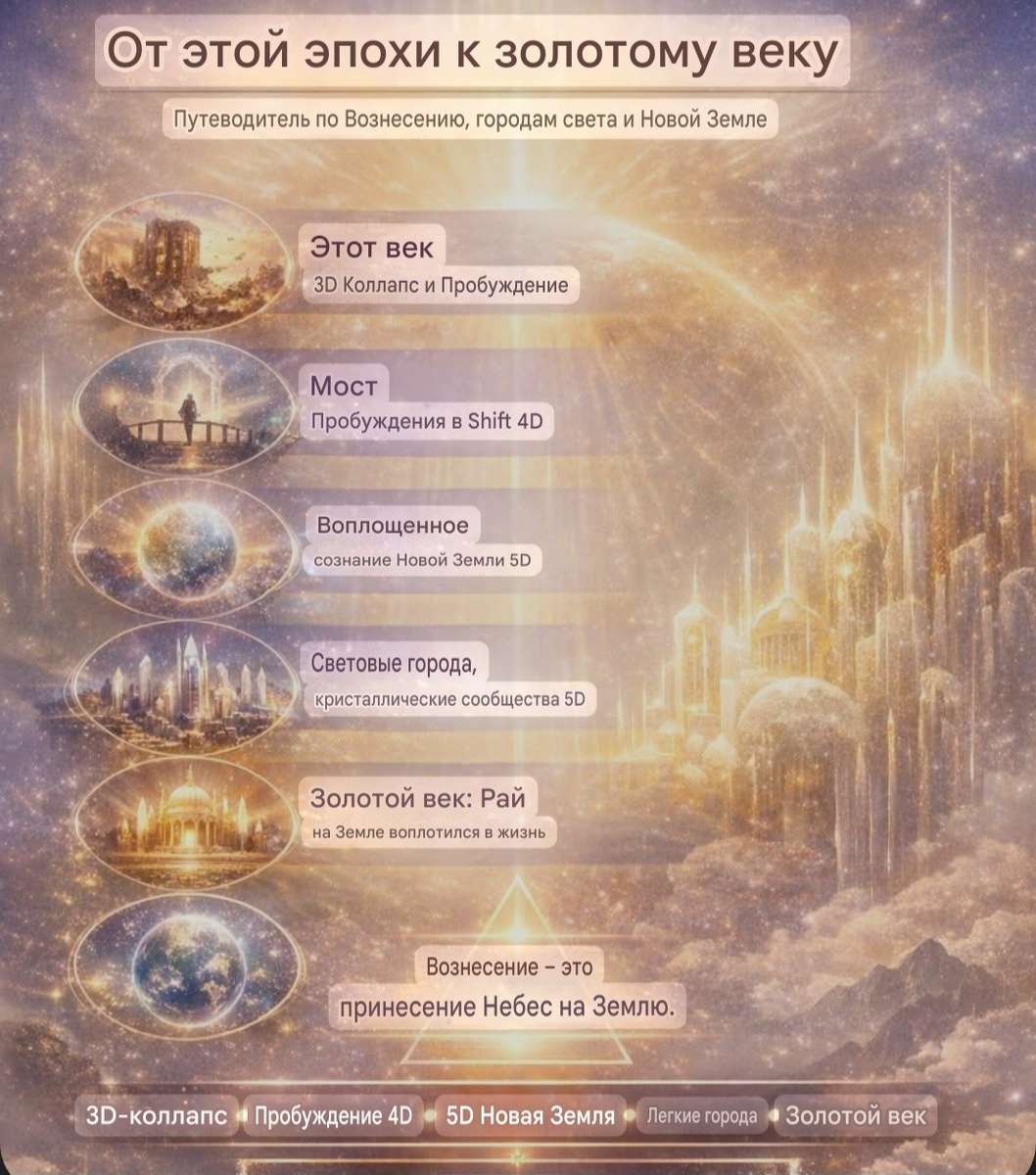 Ниже представлена кристаллическая карта — живой обзор пути души от растворяющейся 3D-матрицы к воплощенному сиянию 5D Новой Земли. Хотя время нелинейно, эта последовательность течет таким образом, что человеческое сердце может почувствовать, проследить и интегрировать ее.