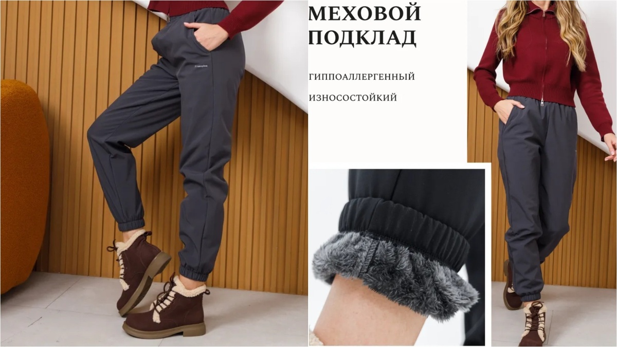 Брюки учитывают особенности женской фигуры, не сковывают и не топорщатся. Идеально подходят для прогулок с детьми или занятия спортом. Они легко заменяют два слоя одежды благодаря меховому утеплителю. Лаконичный дизайн позволяет сочетать их с любимыми пуховиками и парками.