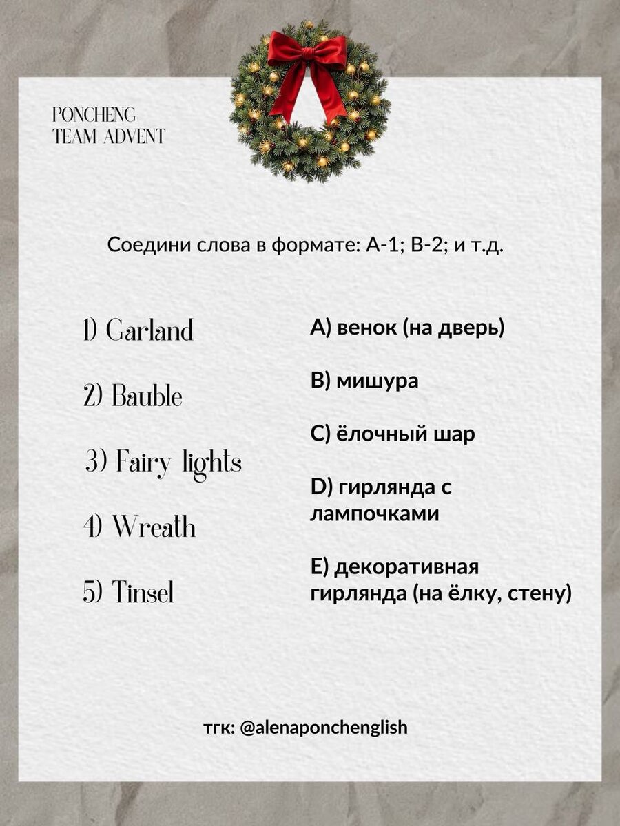 Попробуй соединить слова с их значением (мысленно или письменно — как тебе удобно): 1️⃣Garland 2️⃣Bauble 3️⃣Fairy lights 4️⃣Wreath 5️⃣Tinsel 🅰️— венок (обычно на дверь) 🅱️— мишура 🔠— ёлочный шар 🔠— гирлянда с лампочками 🔠— декоративная гирлянда (на ёлку, стену) Справились? 🥰 (ответы для проверки себя в комментариях) ✨ Мини-челлендж для прокачки: Выбери 3 слова из списка и составь с каждым своё предложение, как будто ты украшаешь дом или рассказываешь о празднике. ➡️Example: “We decorated the living room with fairy lights and a wreath.” #PonchEnglishAdvent