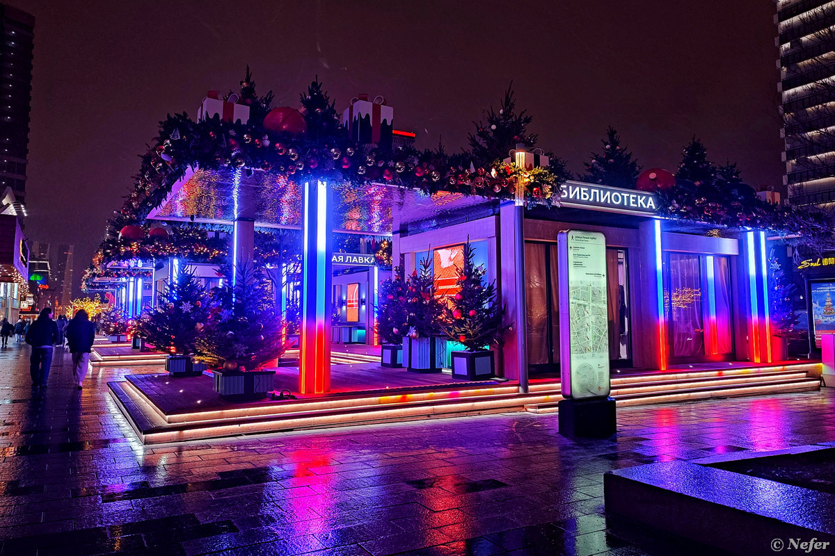 Фестивальная площадка на Новом Арбате посвящена чтению. В павильоне расположилась библиотека. Светится, аж глазам больно. За ней книжная лавка, в которой продается художественная литература с зимним настроением, сказки, открытки, подарочные издания книг и другие тематические товары. Неподалеку гигантская коробка конфет. Это одновременно и арт-объект, и павильон. Внутри магазин, продаются конфеты, пряники и другие сладости. Там можно попробовать и приобрести чайный купаж "Москва", который выбирали народным голосованием в прошлом году. Вообще весь Новый Арбат ярко украшен. Он и так обычно светится, а под Новый год еще сильнее. Потом можно нырнуть в переулок, например, Большой Николопесковский, догулять до Старого Арбата и окунуться в мандариновое настроение. На видео вся прогулка целиком: огромный самовар в начале Старого Арбата, мандарины, мандарины, мандарины, кусочек Нового Арбата и гламурный Тверской бульвар с его дизайнерскими елками Другие праздничные локации:
