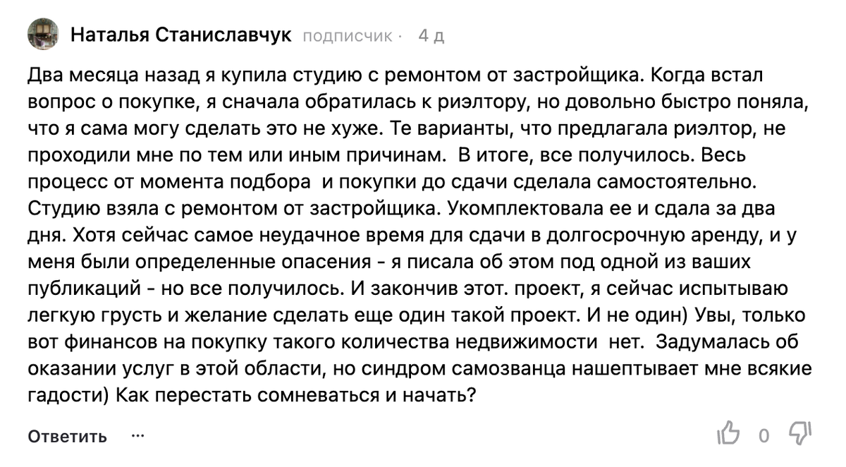 Недавно читательница написала большой комментарий к моему видео, но произошел какой-то технический сбой, и на сайте комментарий пропал, а в админке остался. И мне бы очень хотелось на него ответить. Суть истории сводилась к тому, что Наталья прошла через опыт ремонта и комплектации своей квартиры и хотела бы делать для других. «Задумалась об оказании услуг в этой области, но синдром самозванца нашептывает мне всякие гадости) Как перестать сомневаться и начать?» В своей прошлой корпоративной жизни, будучи продакт-менеджером, я проводила много исследовательских интервью с пользователями. В частности, много общалась с предпринимателями, спрашивала у них, как они решают те или иные вопросы, задачи, особенно новые, с которыми раньше не сталкивались. И практически каждый отвечал: «Ну как – беру и решаю. Начинаю изучать вопрос, гуглить, спрашивать. Ткнусь сюда, спрошу тут, узнаю там – и так понемногу продвигаюсь». Приводили конкретные прим