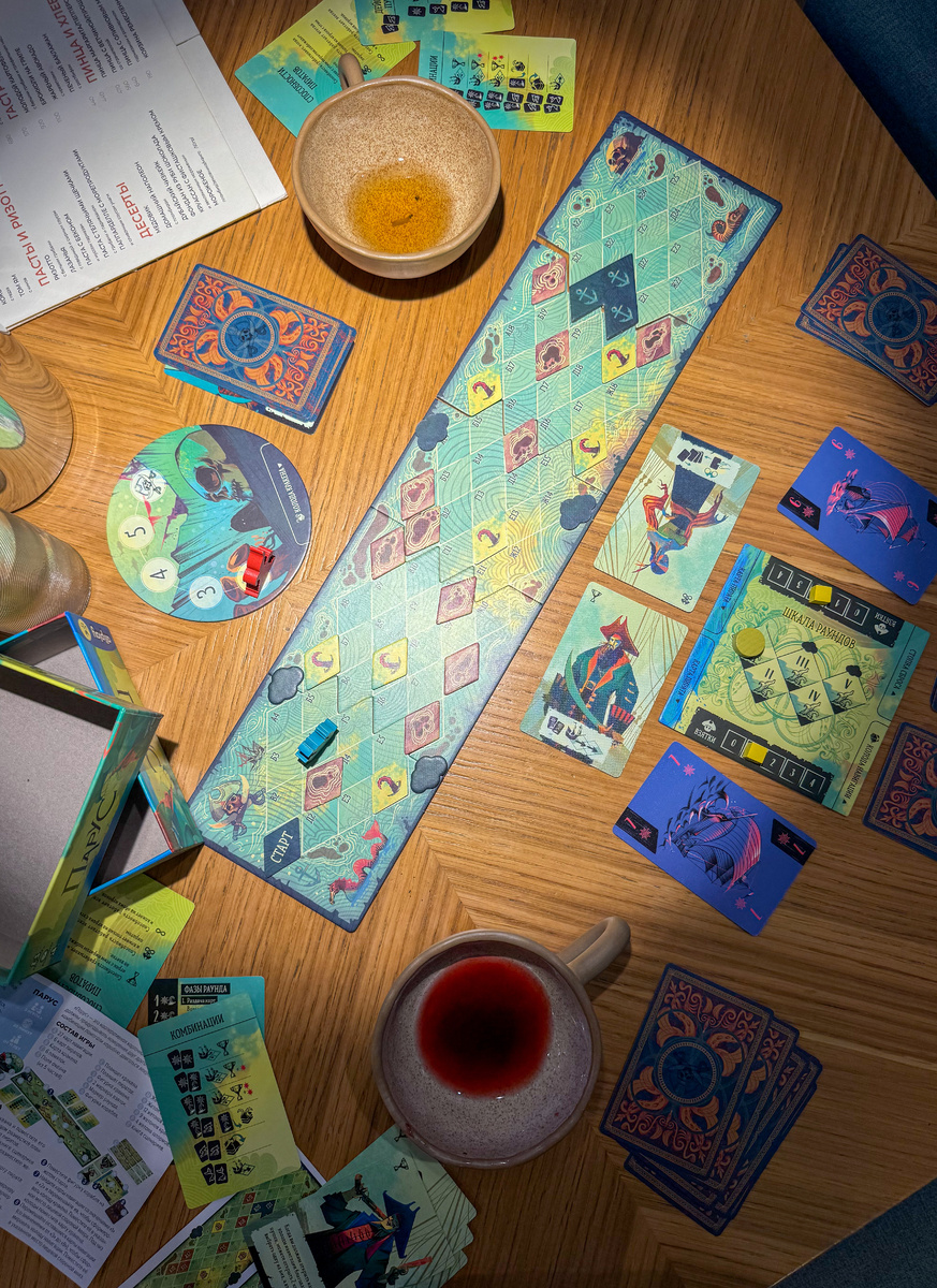 Не так давно писала про «Джекила и Хайда против Скотланд-Ярда» в этом же сегменте, и вот «Парус» тоже блещет нетривиальной концепцией — более оригинальной, на мой взгляд, чем в «ДиХ», благодаря особенному перемещению по полю, зависящему от того, кто забирает взятку в игре. Именно это задаёт вектор сложности игры, и как раз самое тяжёлое в этом трике — попытаться правильно совершить обмен на старте и потом скоординировать ваши действия, чтобы за раунд пройти максимальный отрезок пути.