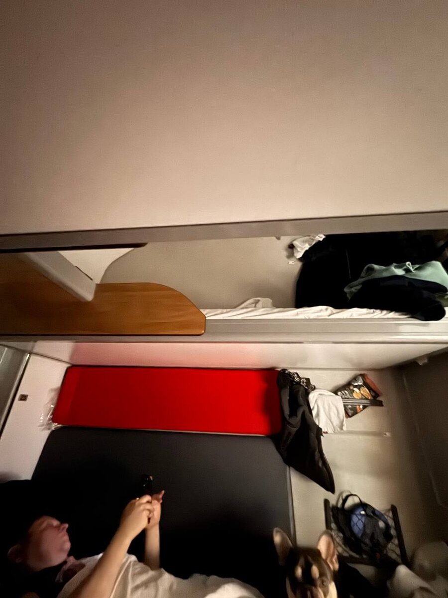 😅 Уже жалею, что не взяла место на верхней полке — даже не подозревала, что там лакшери. Ещё тут красавчик пёс, влюбилась с первого взгляда, чувствую, что у нас это взаимно.