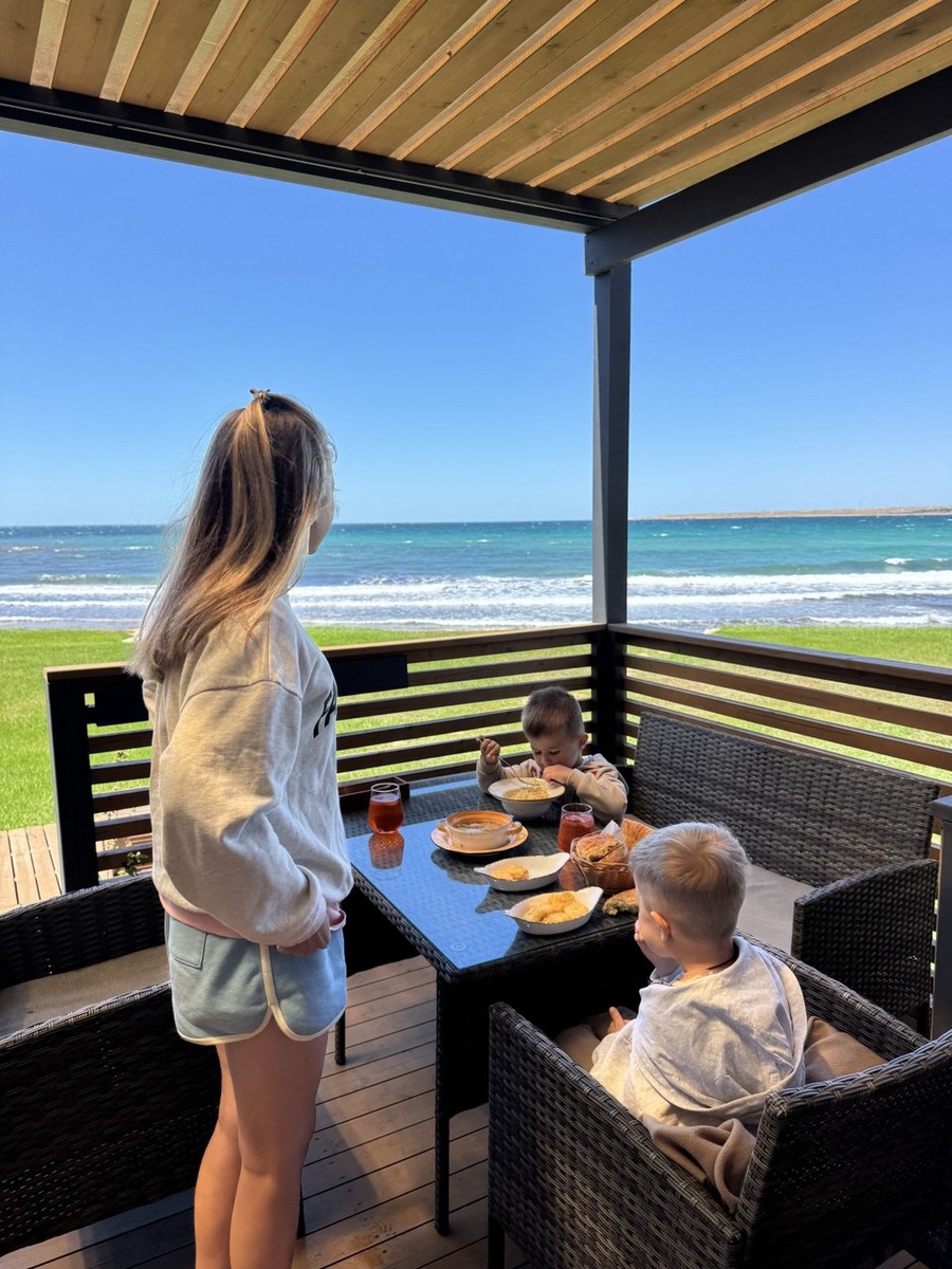 - Вид и территория. Лаконичные, стильные домики, ухоженная поляна с травой, где дети могли безопасно бегать и играть — просто праздник после тесных пляжей.