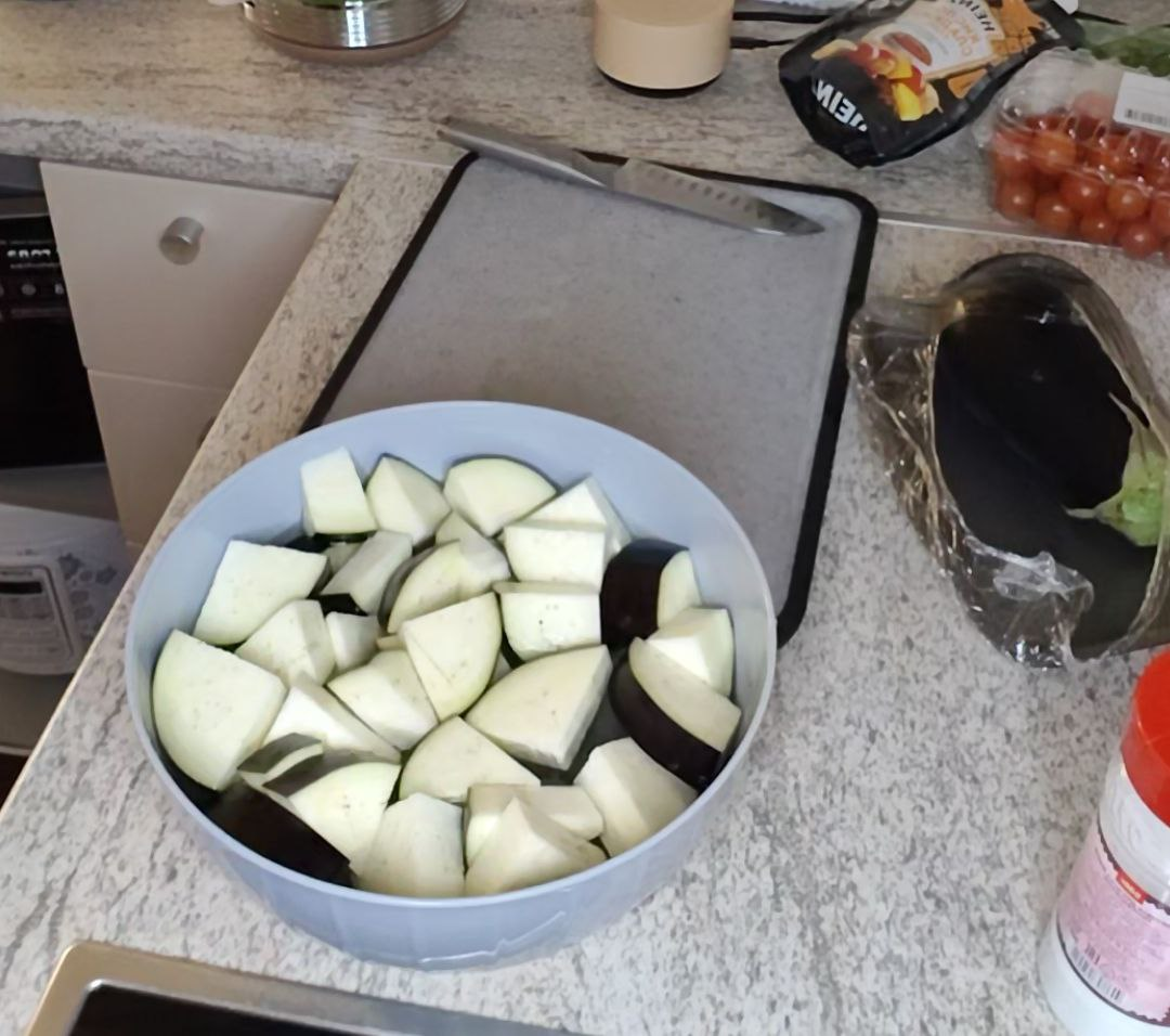 В новогоднюю ночь хочется разнообразить застолье новыми вкусами. Но большинство рецептов для нового года содержат майонез и другие ингредиенты, которые тяжело перевариваются. Обычный салат из огурцов и помидоров уже не ощущается праздничным. Поэтому советую попробовать приготовить грузинский салат с хрустящими баклажанами! P.S. даже, когда баклажаны становятся мягкими, салат не теряет свой вкус. Для заправки: Важно: советую готовить баклажаны в последнюю очередь, чтобы они оставались хрустящими при подаче. Баклажаны нужно нарезать средними кусочками. Мне нравится сначала разрезать их на круги, а потом делить на 4 части. Также их важно замочить в теплой подсоленной воде, чтобы убрать горечь. Я замачиваю на пару минут, но вода уже мутнеет. Затем выложите баклажаны на бумажное полотенце, чтобы ушла лишняя влага. Затем, когда баклажаны подсохнут, их нужно обвалять в кукурузном крахмале. Но у меня его не было, поэтому я использовала муку, и приготовить до хрустящей корочки во фритюре. Вмес