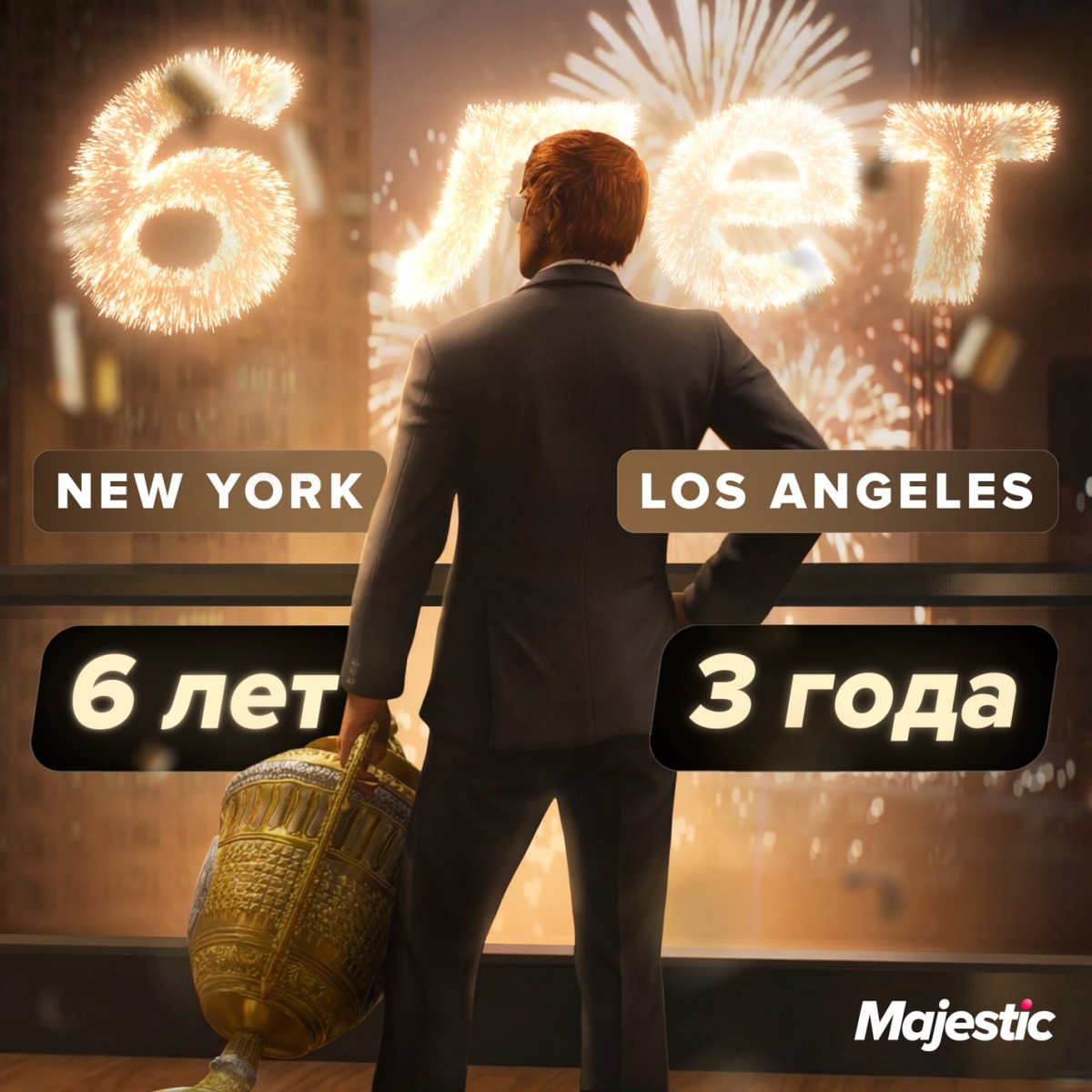 Сейчас мы будем задувать свечи и загадывать желание Ведь у нас ДЕНЬ РОЖДЕНИЯ! Путь нашего проекта начался 6 лет назад с открытия сервера New York, а позже, в этот же день, был открыт Los Angeles, которому сегодня исполняется 3 года. Говорят, именинникам можно все, поэтому мы решили, что сегодня получать подарки будете вы: Запускаем акцию на всех серверах — 1000 MC и 5000 опыта Зимнего пропуска за 5 часов игры 🥳 🎂 Поздравляем всех игроков проекта — именно вы каждый день создаете историю Majestic RP. ❤️ Majestic Role Play