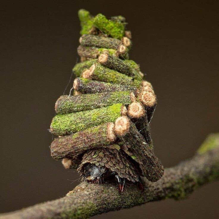 Среди чешуекрылых встречаются насекомые, мало похожие на бабочек в их классическом исполнении. Семейство Мешочницы (Psychidae) включает более 1300 видов бабочек и получило свое название за оригинальные «домики» - чехлики, или мешки, которые их личинки – гусеницы лепят из «подручного» природного материала. Наиболее распространены в Африке, саваннах Южной Америки, в России известно более 100 видов в средней полосе и южнее. После вылупления молодые личинки начинают плести вокруг себя мешок из шелковых нитей, выделяемых видоизмененными слюнными железами. По мере своего роста они постоянно достраивают его основу. Снаружи этого чехлика прикрепляют сухие веточки, листики, почву, камешки. Дизайнерские предпочтения в отношении строительных материалов, геометрии «домика» предопределены генетически и являются важной видовой особенностью. Например, чехлик бабочки-улитки состоит из сцементированных почвой экскрементов и имеет спиральную форму, напоминающую раковину брюхоногого моллюска. Лишайников