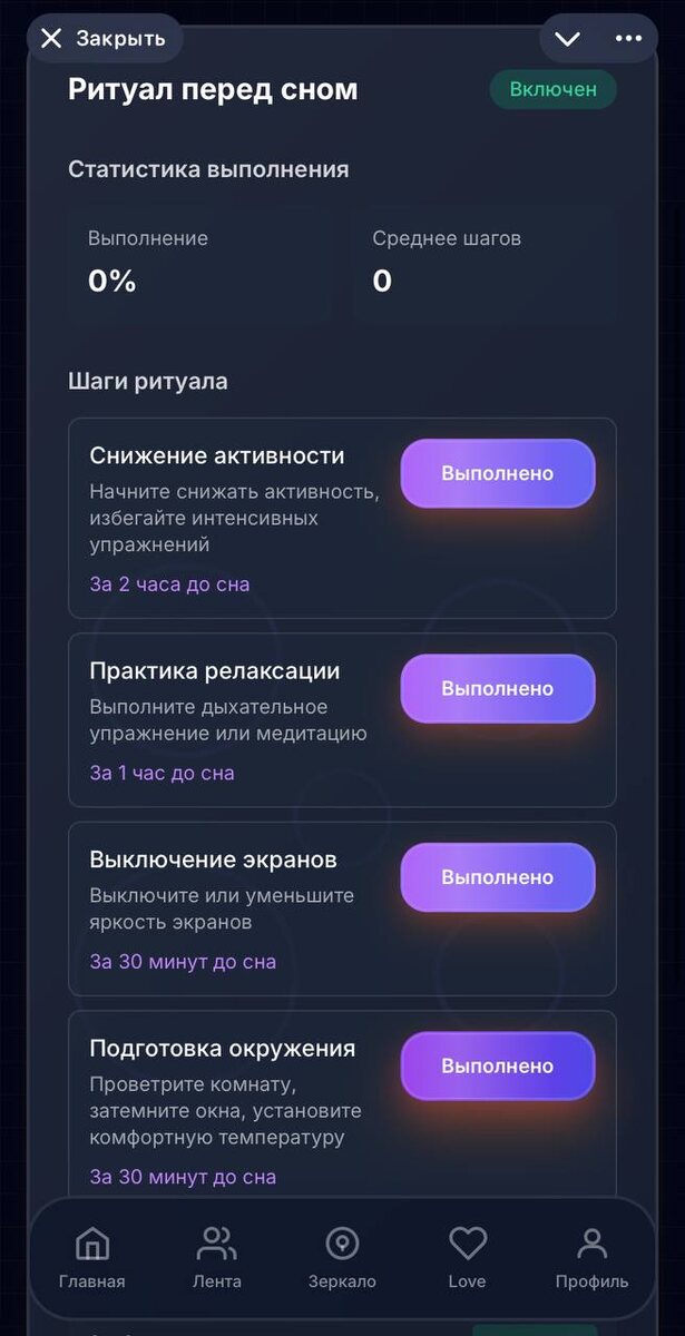 Ритуал перед сном в Mirror: зачем "рутина" и как она снижает ночную тревожность Перед сном мысли начинают гоняться по кругу? "А что если завтра не получится? А вдруг я что-то забыл? А что они подумают?" Это не просто "не могу уснуть". Это тревога, которая активируется в тишине. Ритуал перед сном - это не про "красоту процесса". Это про снижение тревоги через предсказуемость. Как это работает: 1) Ритуал = предсказуемость Ваш мозг знает: "сейчас я делаю X, потом Y, потом Z, потом сплю". Нет места для хаоса и тревоги. 2) Ритуал = сигнал для мозга "Сейчас время отдыхать, а не решать проблемы". Мозг переключается в режим покоя. 3) Ритуал = контроль Вы контролируете процесс, а не мысли контролируют вас. Mirror создаёт персональный ритуал: - Анализирует ваши паттерны (когда вы ложитесь, что мешает заснуть) - Предлагает шаги именно для вас (не общие "медитация", а конкретные действия) - Отслеживает выполнение (вы отмечаете выполненные шаги) Пример ритуала от Mirror: 1) Выключить телефон за час